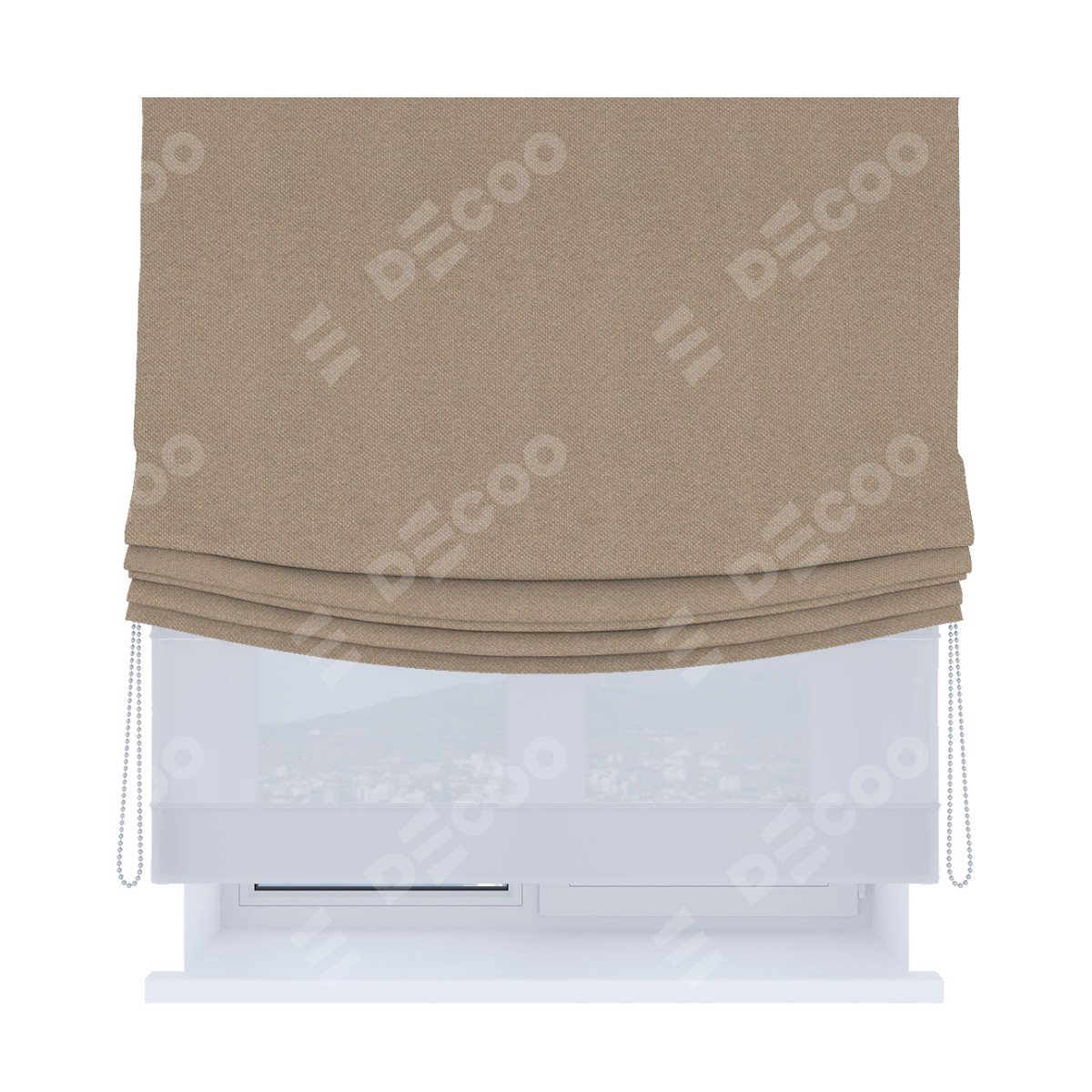 Римская штора день-ночь производителя «Cortin», используется для проёма, пошита из двух полотен, с лицевой стороны лён димаут светло-бежевый артикул 00002, вторая ткань тюль (по стандарту комплектуется тюль белого цвета артикул V-01). Имеет универсальный механизм и подходит для монтажа: на потолок, на стену и в нишу. Удобное управление каждой шторой отдельно.
