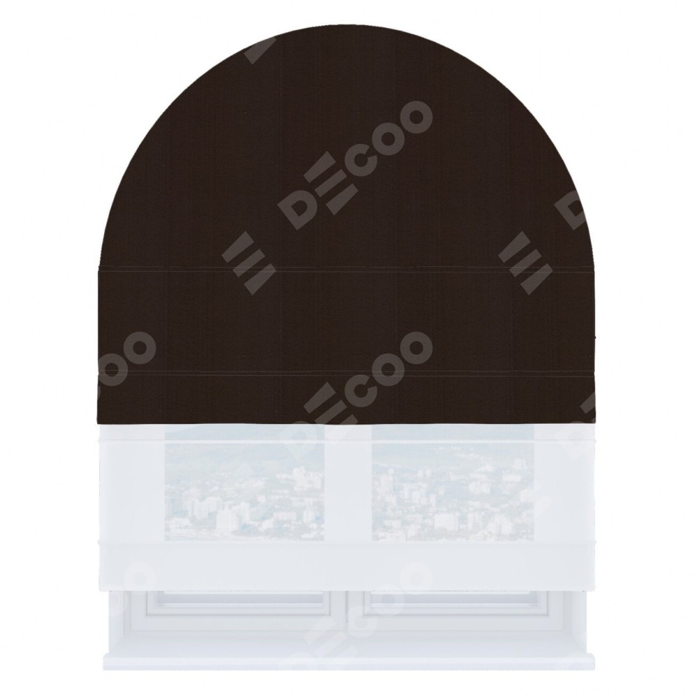 Римская штора день-ночь производителя «Cortin», используется для арочного проёма, пошита из двух полотен, с лицевой стороны блэкаут однотонный тёмно-коричневый артикул 88287, вторая ткань тюль (по стандарту комплектуется тюль белого цвета артикул V-01). Штора шьётся по индивидуальным размерам, для данного типа римской шторы возможная ширина от 60 до 300 см. Удобное управление каждой шторой отдельно.