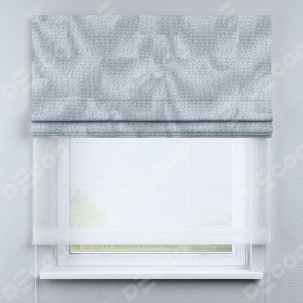 Римская штора день-ночь производителя «Cortin», используется для проёма, пошита из двух полотен, с лицевой стороны лён димаут серый артикул F3, вторая ткань тюль (по стандарту комплектуется тюль белого цвета артикул V-01). Имеет универсальный механизм и подходит для монтажа: на потолок, на стену и в нишу.