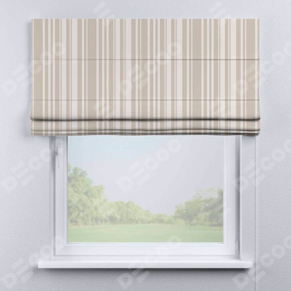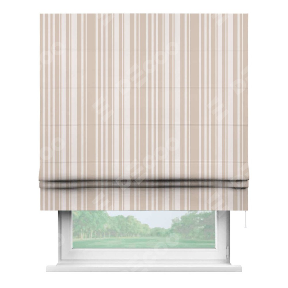 Римская штора производителя «Cortin», используется для проёма, пошита из ткани блэкаут с нанесением сублимационной печати «Бежевые вертикальные полоски». Имеет универсальный механизм и подходит для монтажа: на потолок, на стену и в нишу.