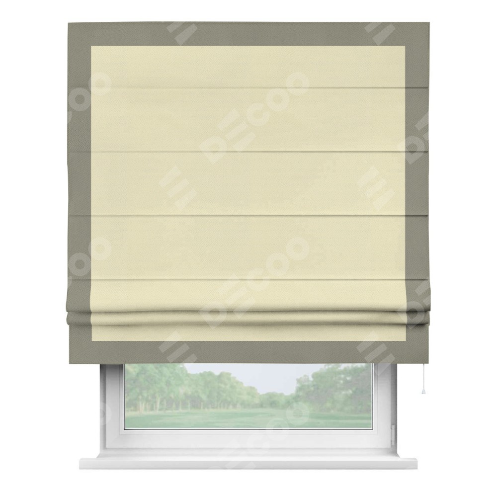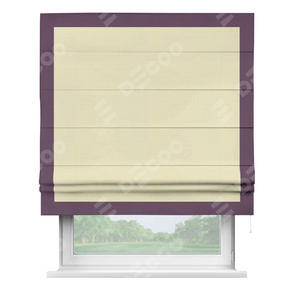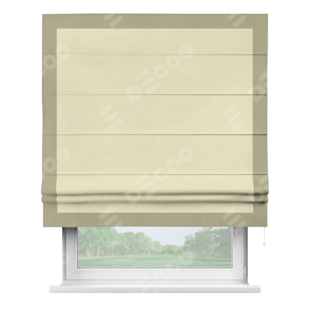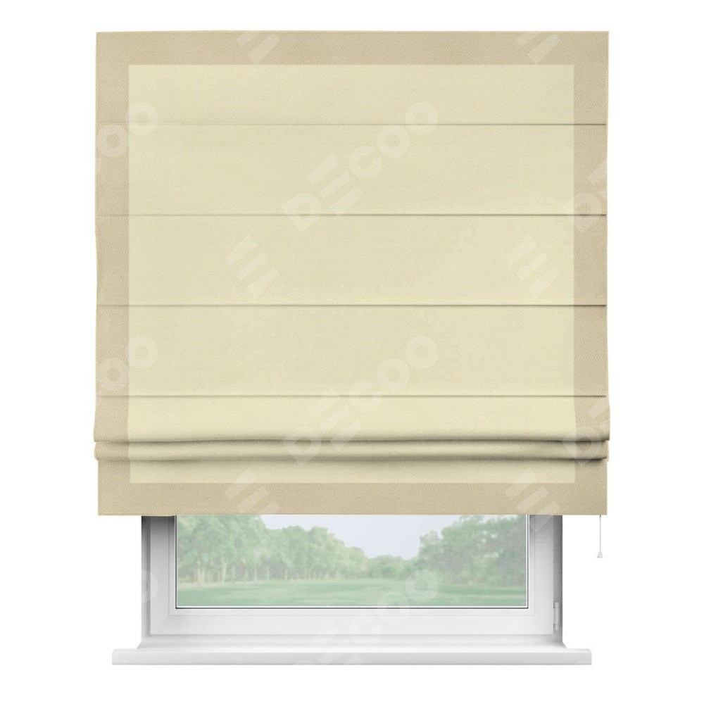 Римская штора производителя «Cortin», используется для проёма, пошита из ткани блэкаут однотонный бежевый, артикул ткани 88283. Отделка шторы кантом «Чесс», ткань для канта используется из блэкаута однотонного разной расцветки на выбор. Имеет универсальный механизм и подходит для монтажа: на потолок, на стену и в нишу.