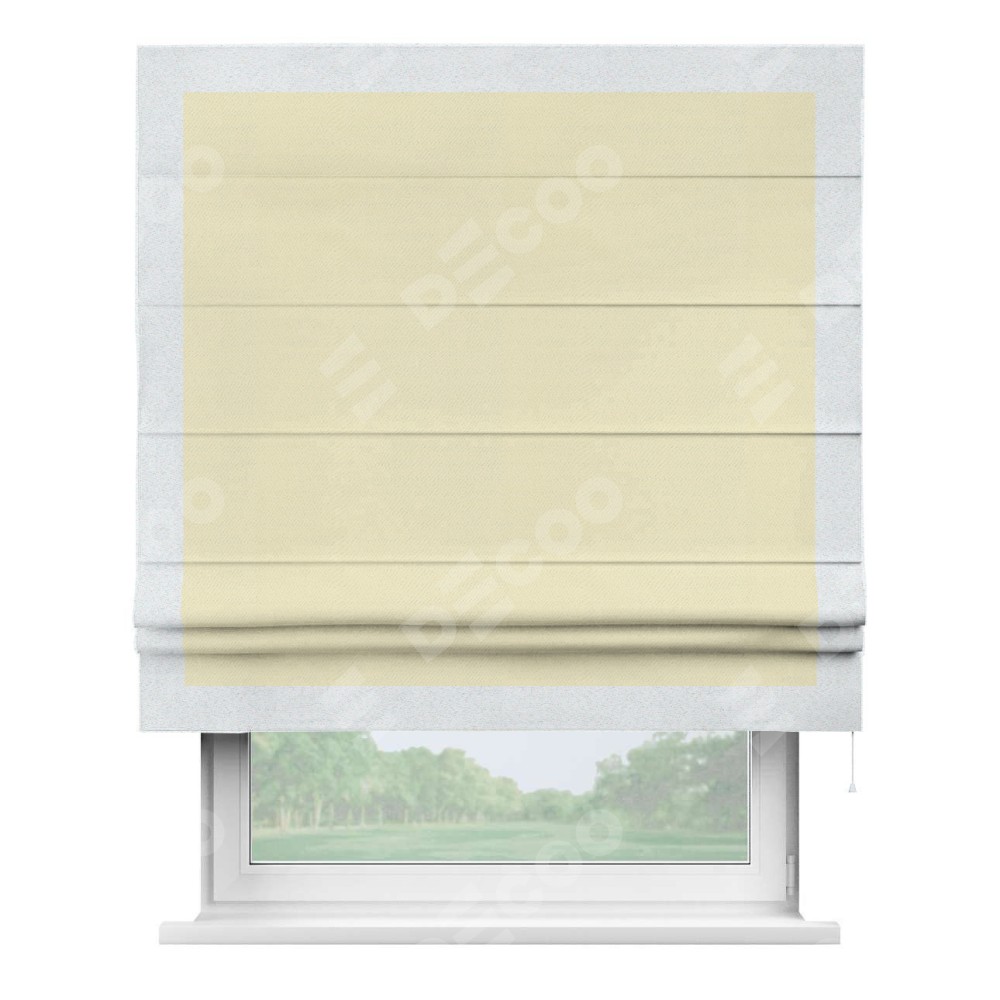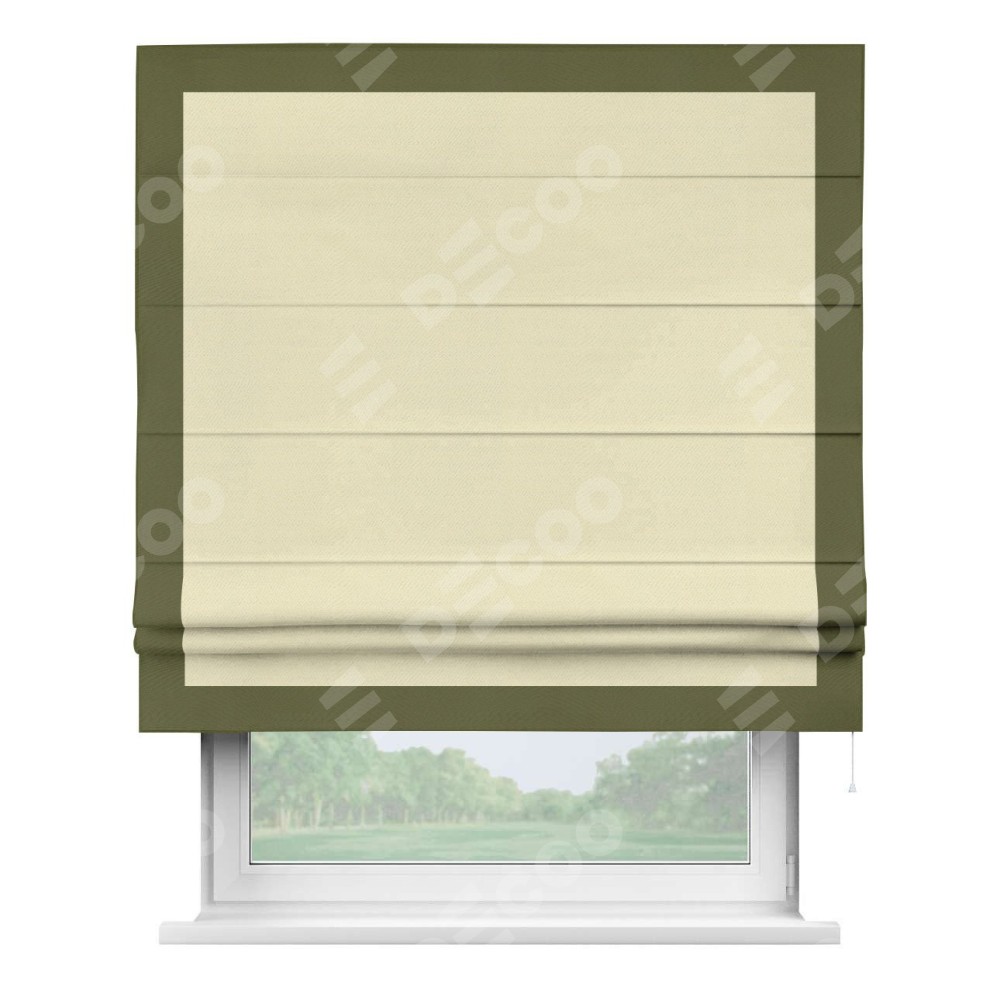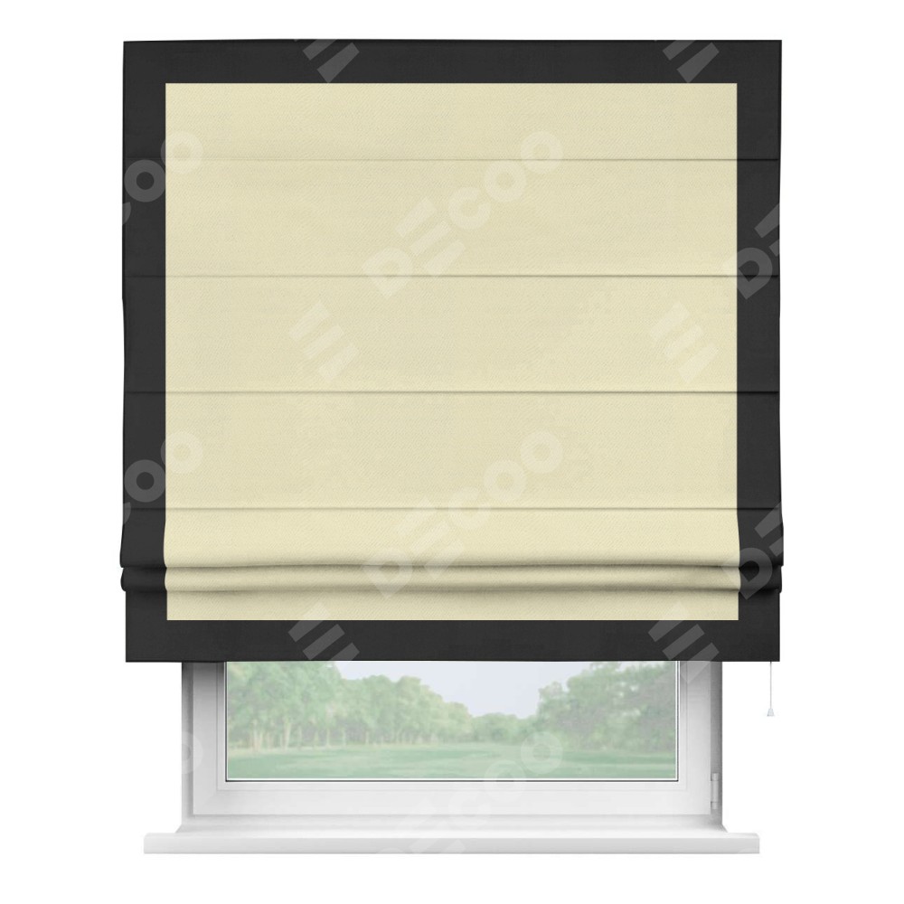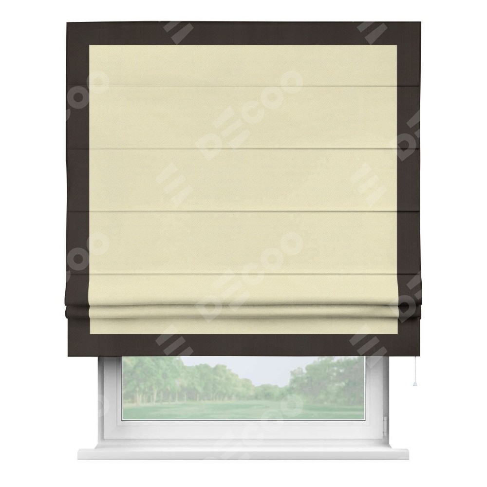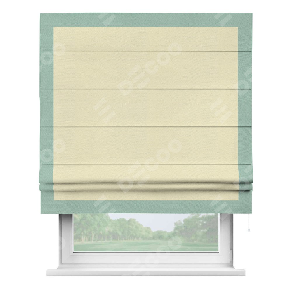 Римская штора производителя «Cortin», используется для проёма, пошита из ткани блэкаут однотонный бежевый, артикул ткани 88283. Отделка шторы кантом «Чесс», ткань для канта используется из блэкаута однотонного разной расцветки на выбор. Имеет универсальный механизм и подходит для монтажа: на потолок, на стену и в нишу.
