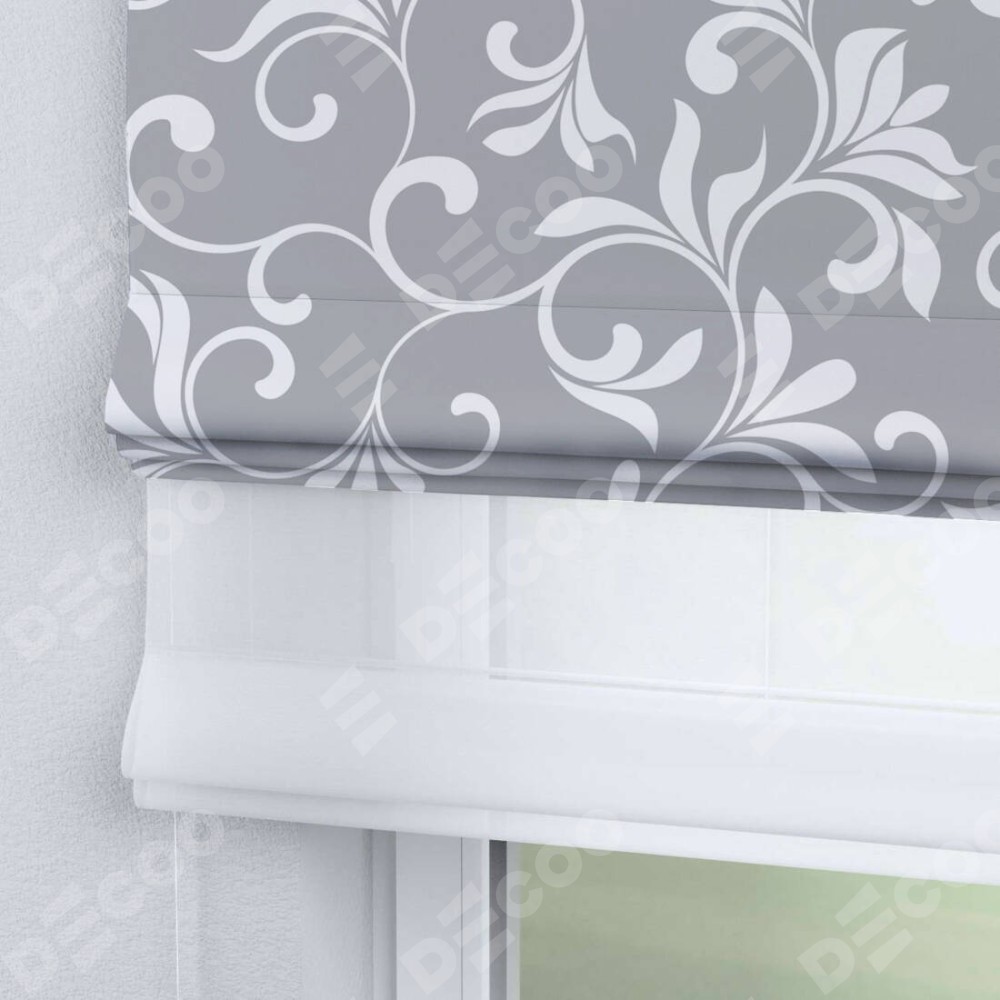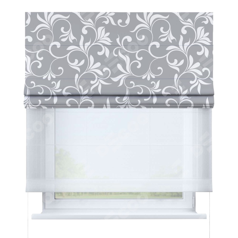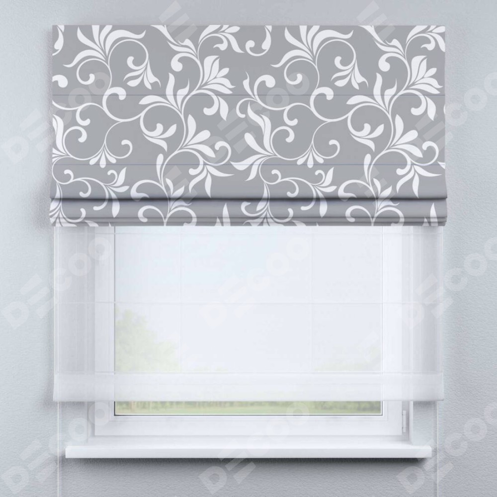 Римская штора день-ночь производителя «Cortin», используется для проёма, пошита из двух полотен, с лицевой блэкаут с нанесением сублимационной печати «Романтический узор», вторая ткань тюль (по стандарту комплектуется тюль белого цвета артикул V-01). Имеет универсальный механизм и подходит для монтажа: на потолок, на стену и в нишу.