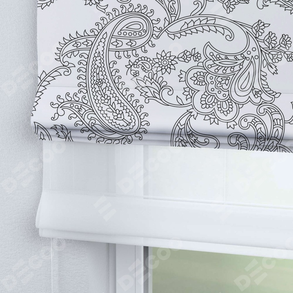 Римская штора день-ночь производителя «Cortin», используется для проёма, пошита из двух полотен, с лицевой блэкаут с нанесением сублимационной печати «Светлый пейсли», вторая ткань тюль (по стандарту комплектуется тюль белого цвета артикул V-01). Имеет универсальный механизм и подходит для монтажа: на потолок, на стену и в нишу.