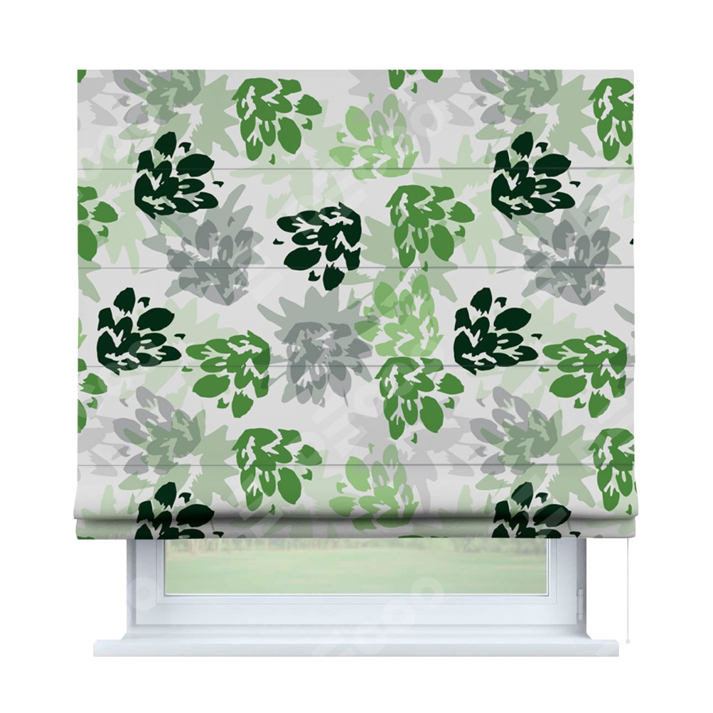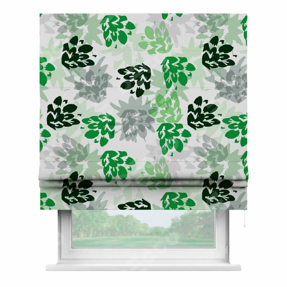 Римская штора производителя «Cortin», используется для проёма, пошита из ткани блэкаут с нанесением сублимационной печати «Зелёный луг». Имеет универсальный механизм и подходит для монтажа: на потолок, на стену и в нишу.