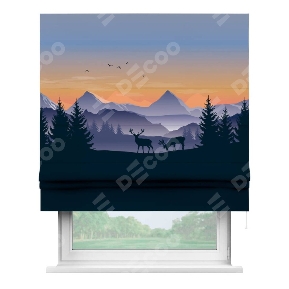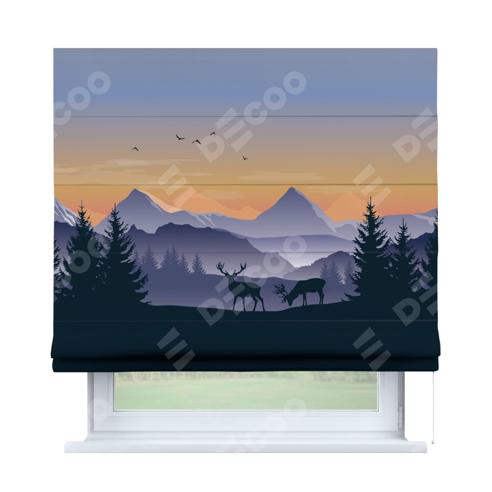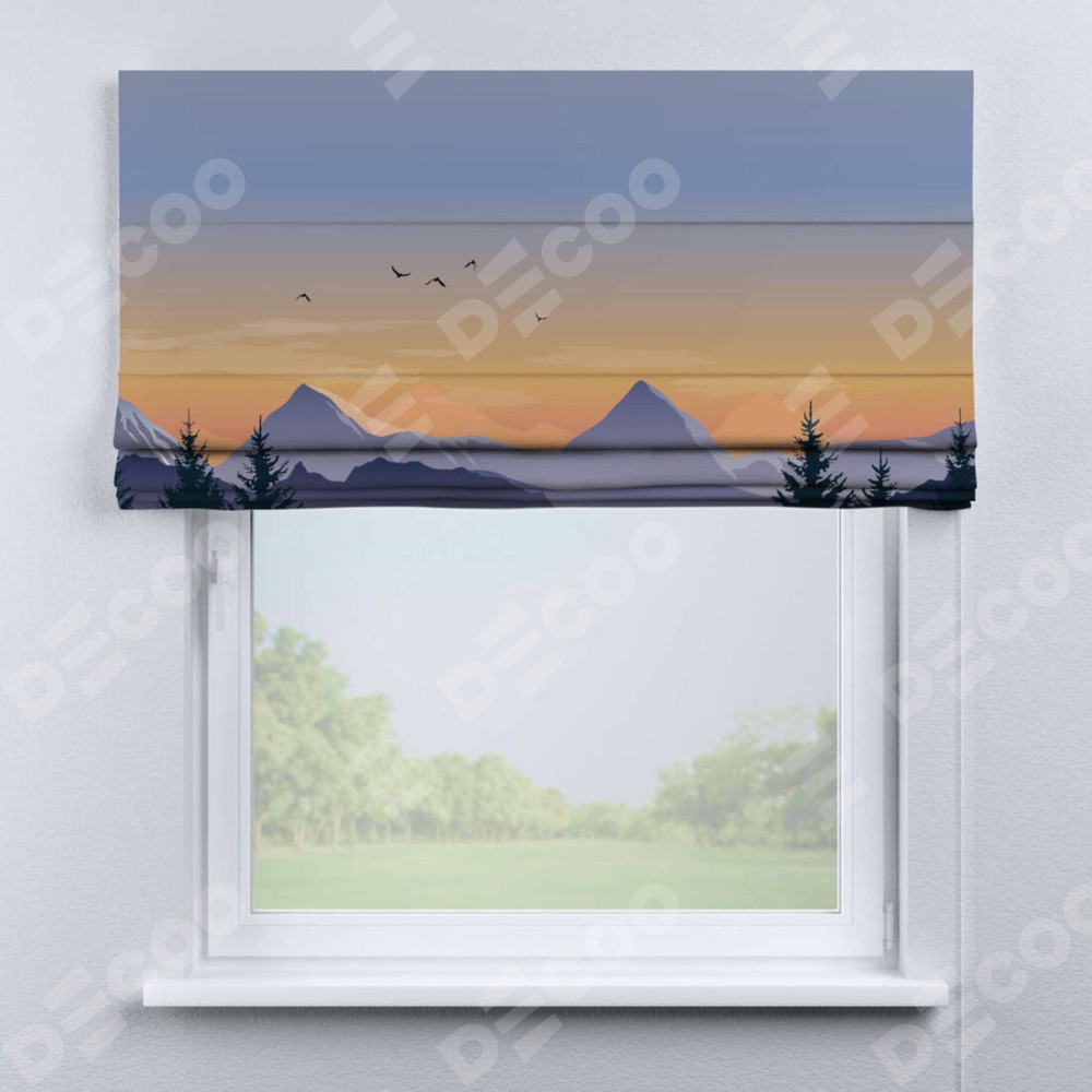 Римская штора производителя «Cortin», используется для проёма, пошита из ткани блэкаут с нанесением сублимационной печати «Закат в горах». Имеет универсальный механизм и подходит для монтажа: на потолок, на стену и в нишу.