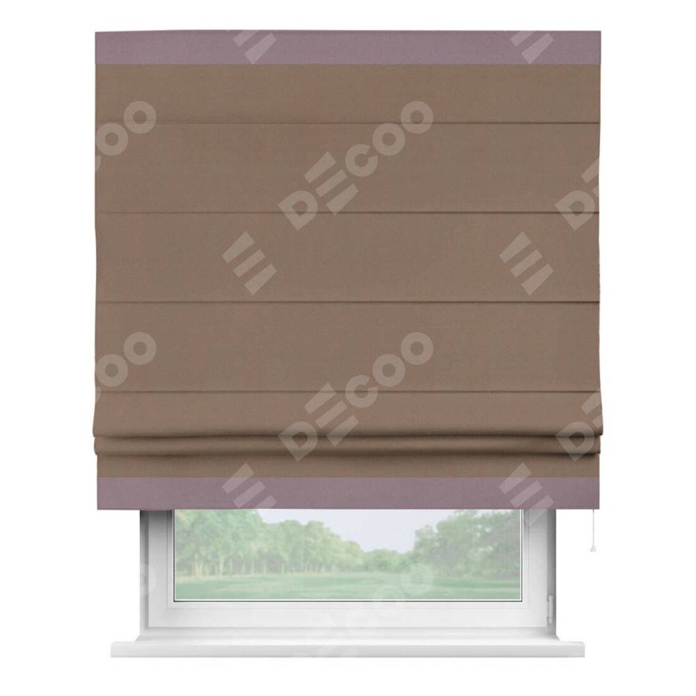 Римская штора производителя «Cortin», используется для проёма, пошита из ткани блэкаут однотонный коричневый, артикул ткани 88285. Отделка шторы кантом «Горизонт», ткань для канта используется из блэкаута однотонного разной расцветки на выбор. Имеет универсальный механизм и подходит для монтажа: на потолок, на стену и в нишу.