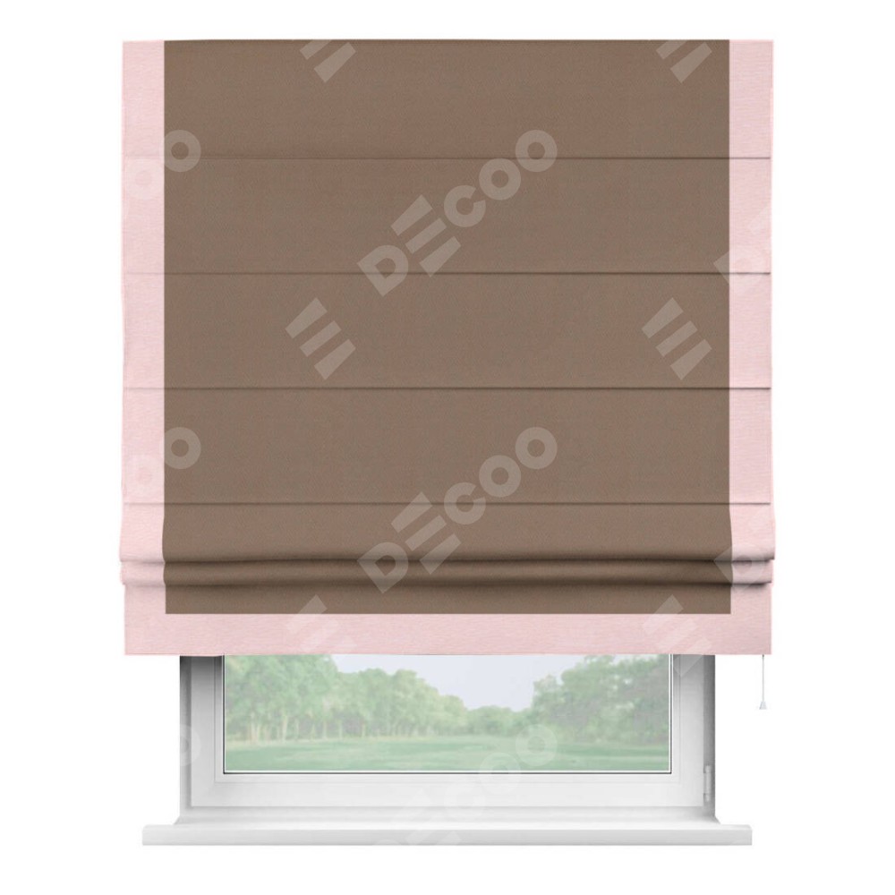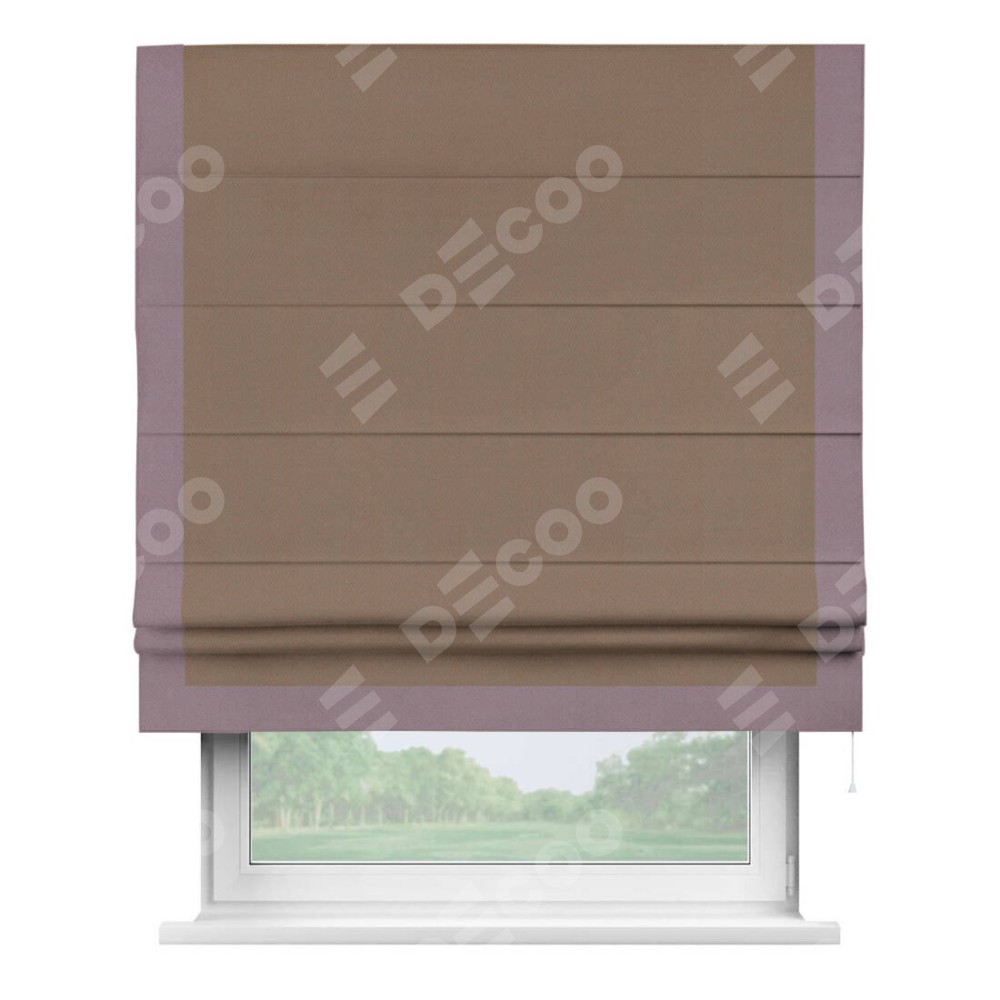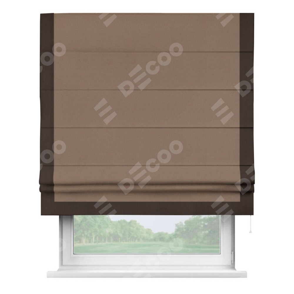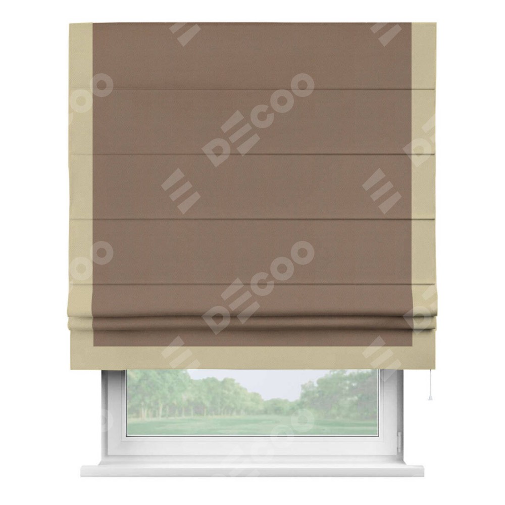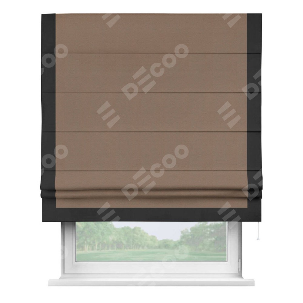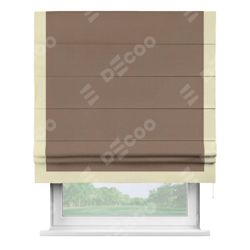 Римская штора производителя «Cortin», используется для проёма, пошита из ткани блэкаут однотонный коричневый, артикул ткани 88285. Отделка шторы кантом «Виктория», ткань для канта используется из блэкаута однотонного разной расцветки на выбор. Имеет универсальный механизм и подходит для монтажа: на потолок, на стену и в нишу.