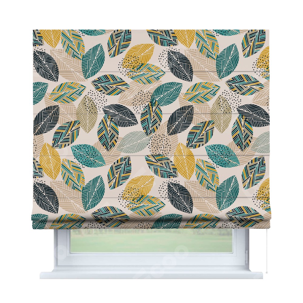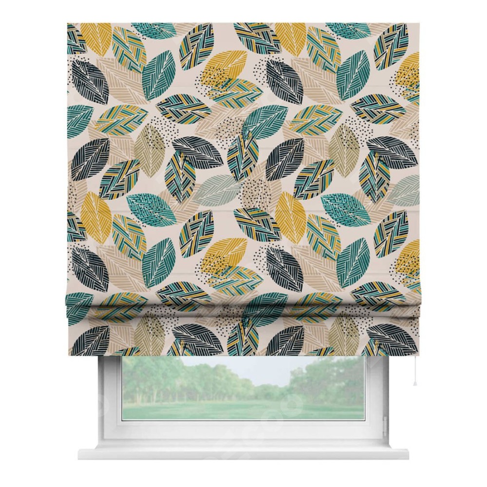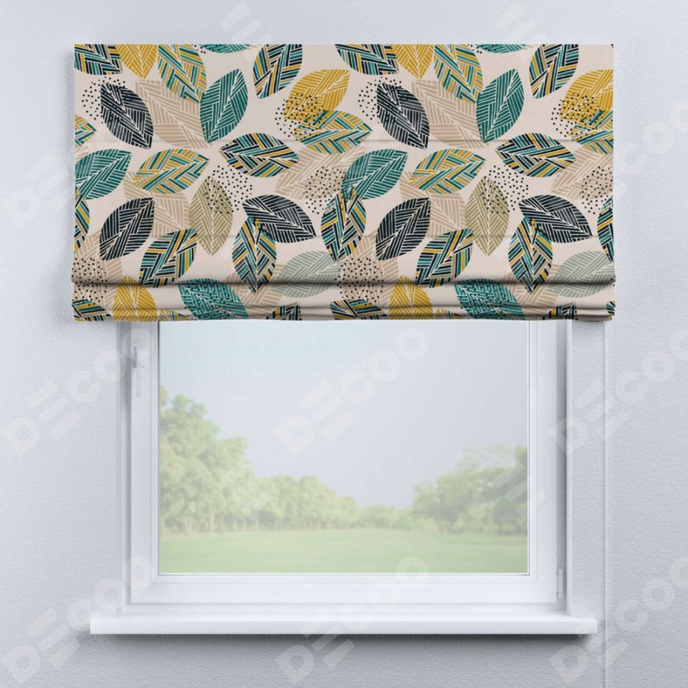 Римская штора производителя «Cortin», используется для проёма, пошита из ткани блэкаут с нанесением сублимационной печати «Листья с орнаментом». Имеет универсальный механизм и подходит для монтажа: на потолок, на стену и в нишу.