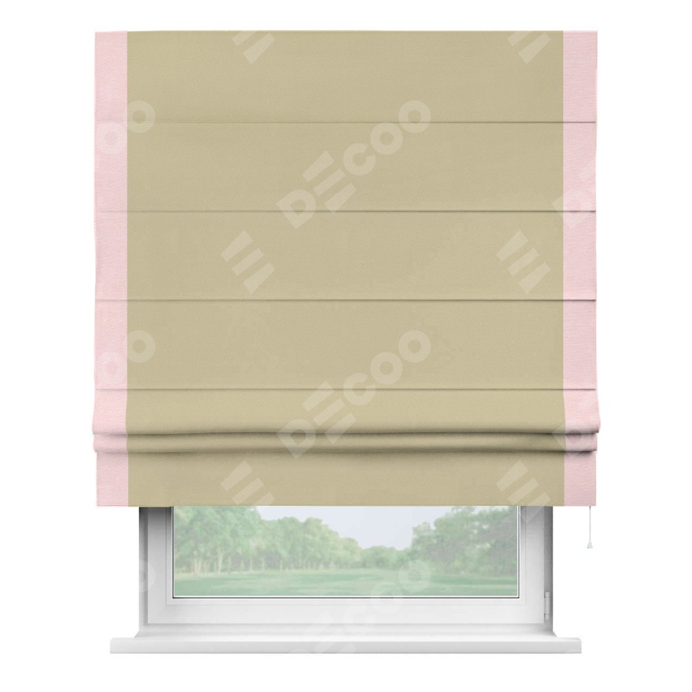 Римская штора производителя «Cortin», используется для проёма, пошита из ткани блэкаут однотонный кофейный, артикул ткани 13130. Отделка шторы кантом «Стрим Дуо», ткань для канта используется из блэкаута однотонного разной расцветки на выбор. Имеет универсальный механизм и подходит для монтажа: на потолок, на стену и в нишу.