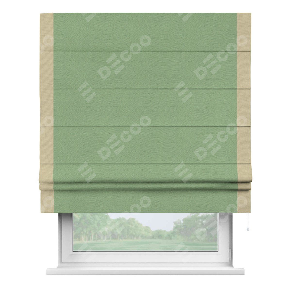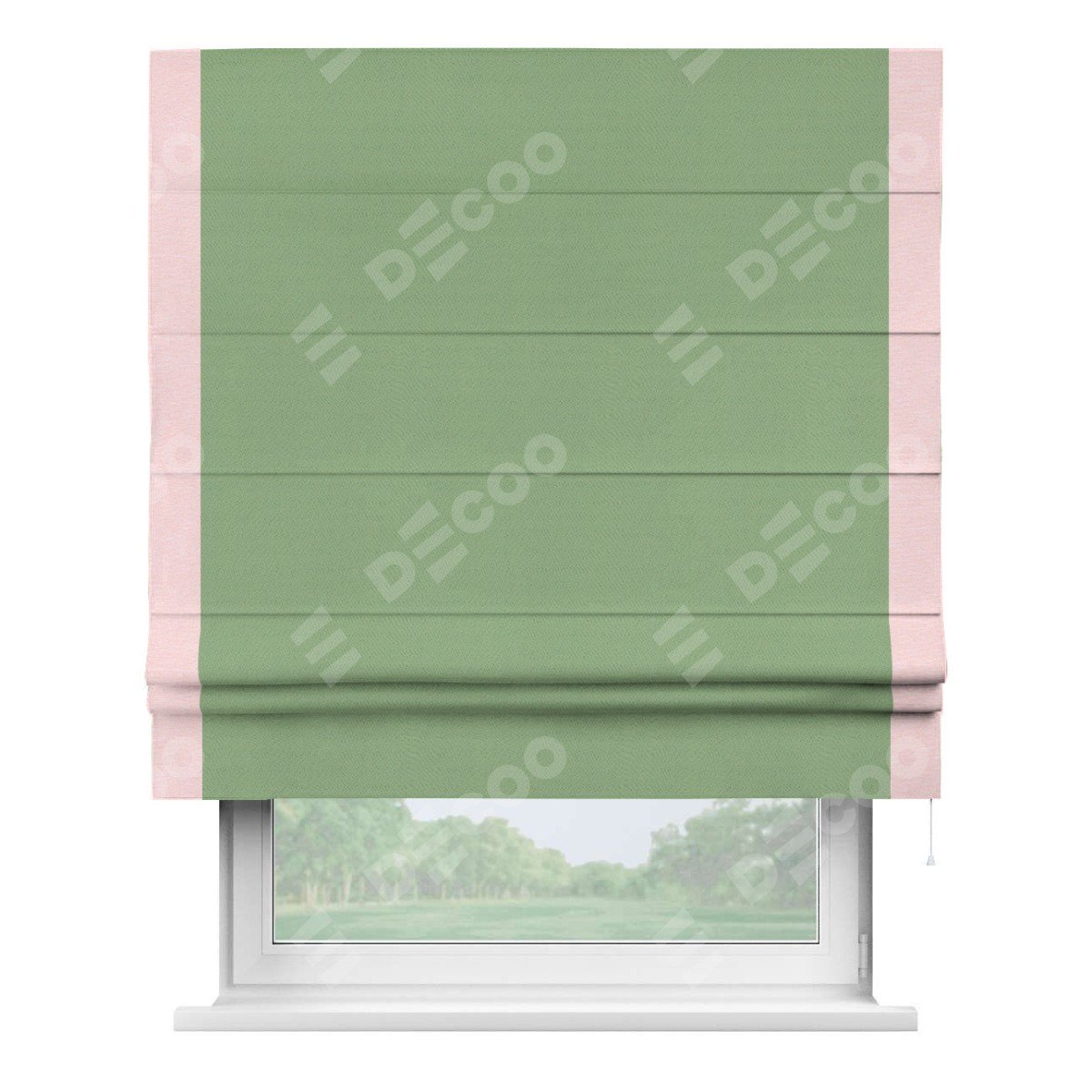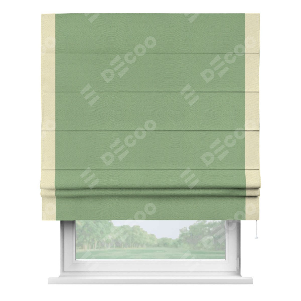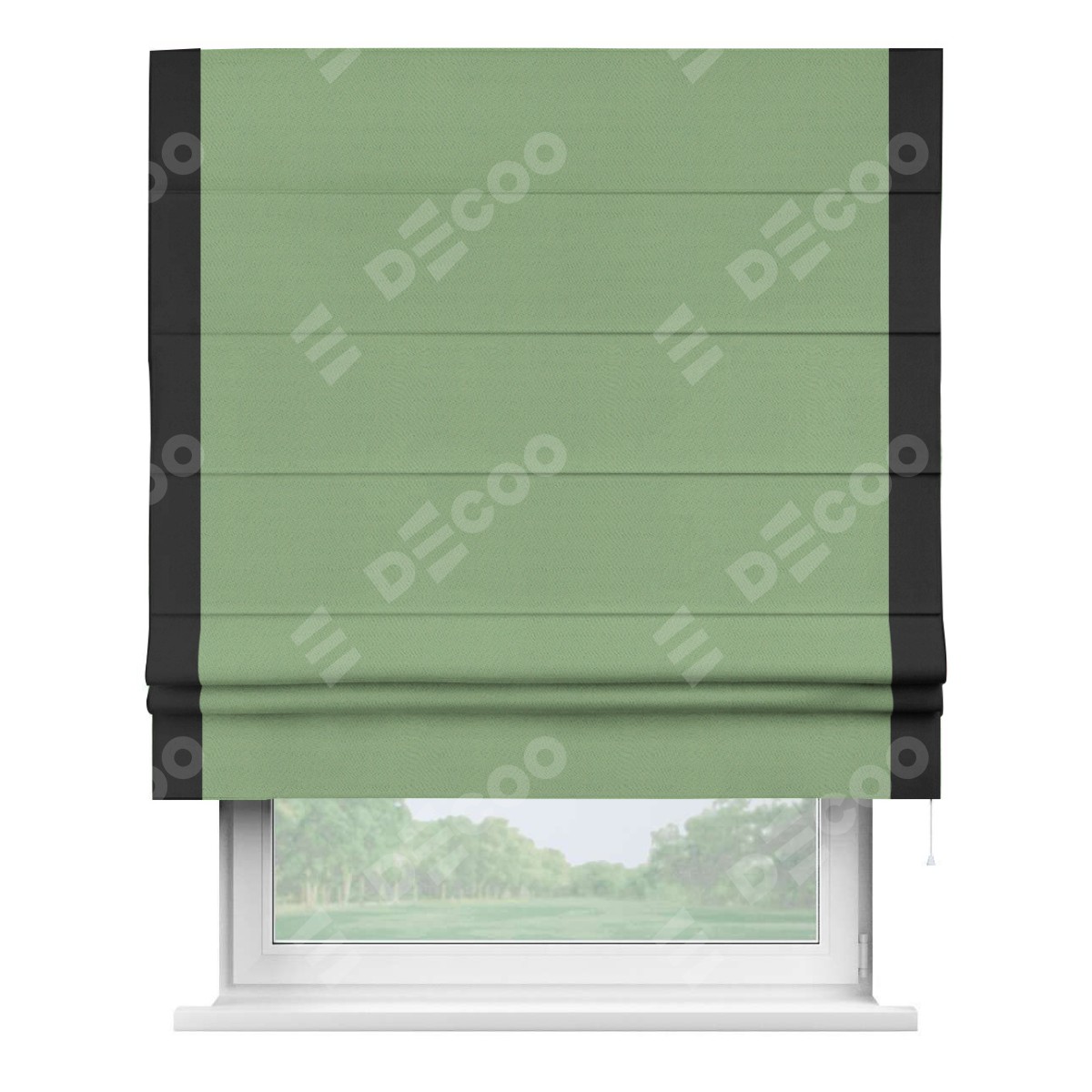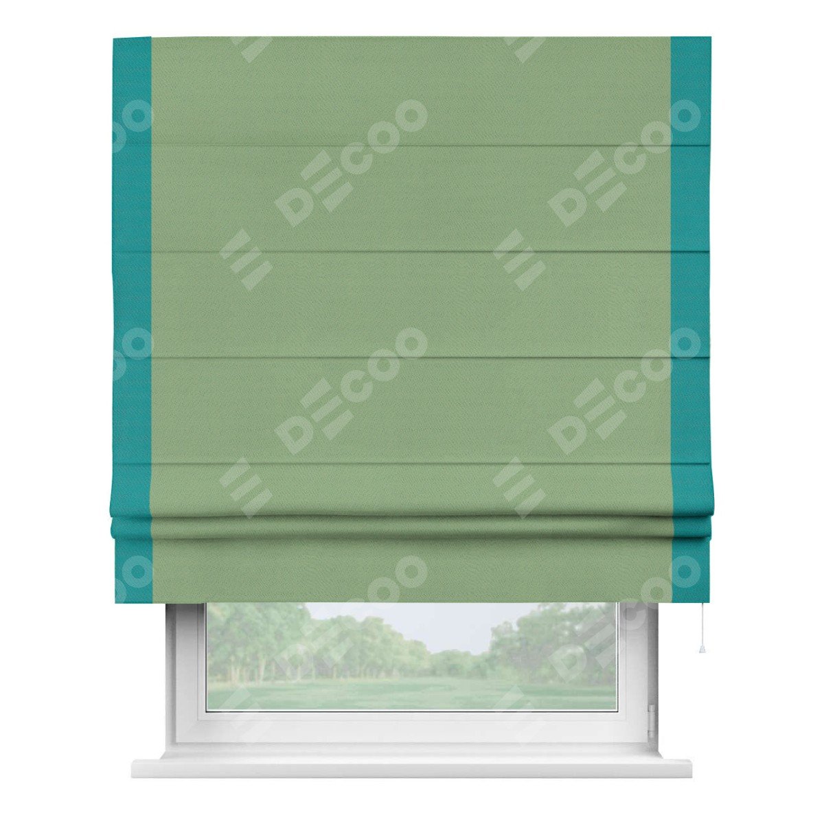 Римская штора производителя «Cortin», используется для проёма, пошита из ткани блэкаут однотонный оливковый, артикул ткани 88300. Отделка шторы кантом «Стрим Дуо», ткань для канта используется из блэкаута однотонного разной расцветки на выбор. Имеет универсальный механизм и подходит для монтажа: на потолок, на стену и в нишу.
