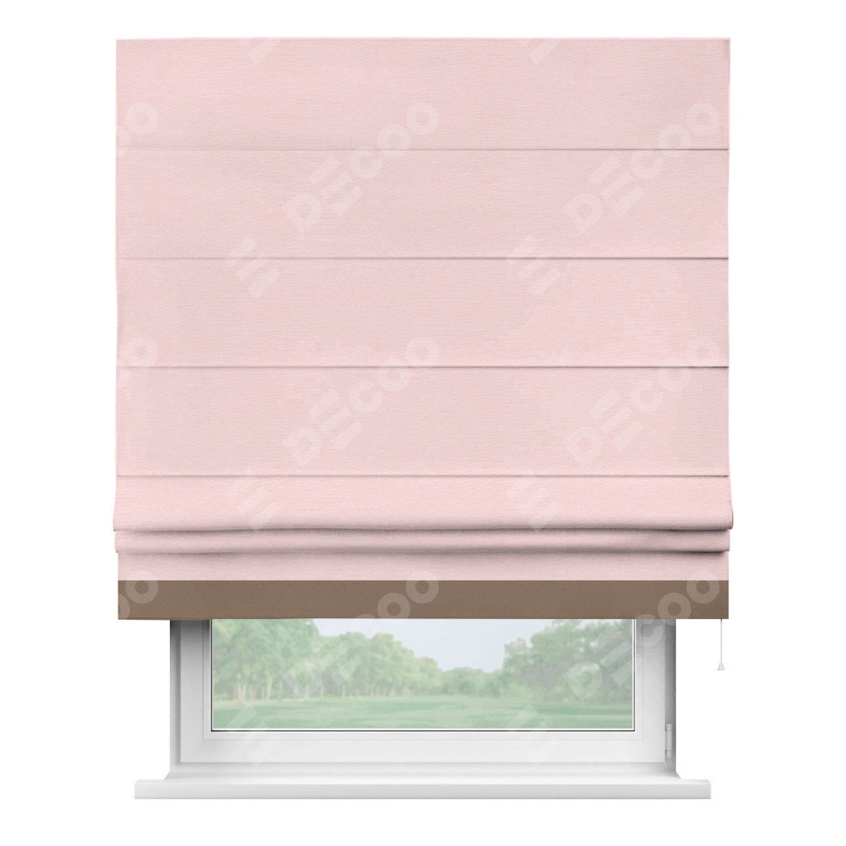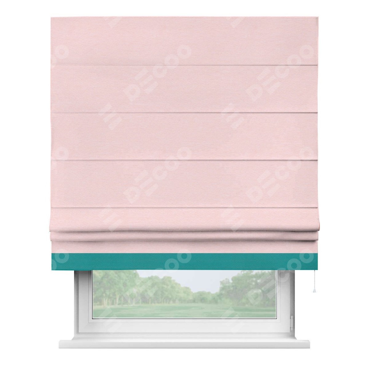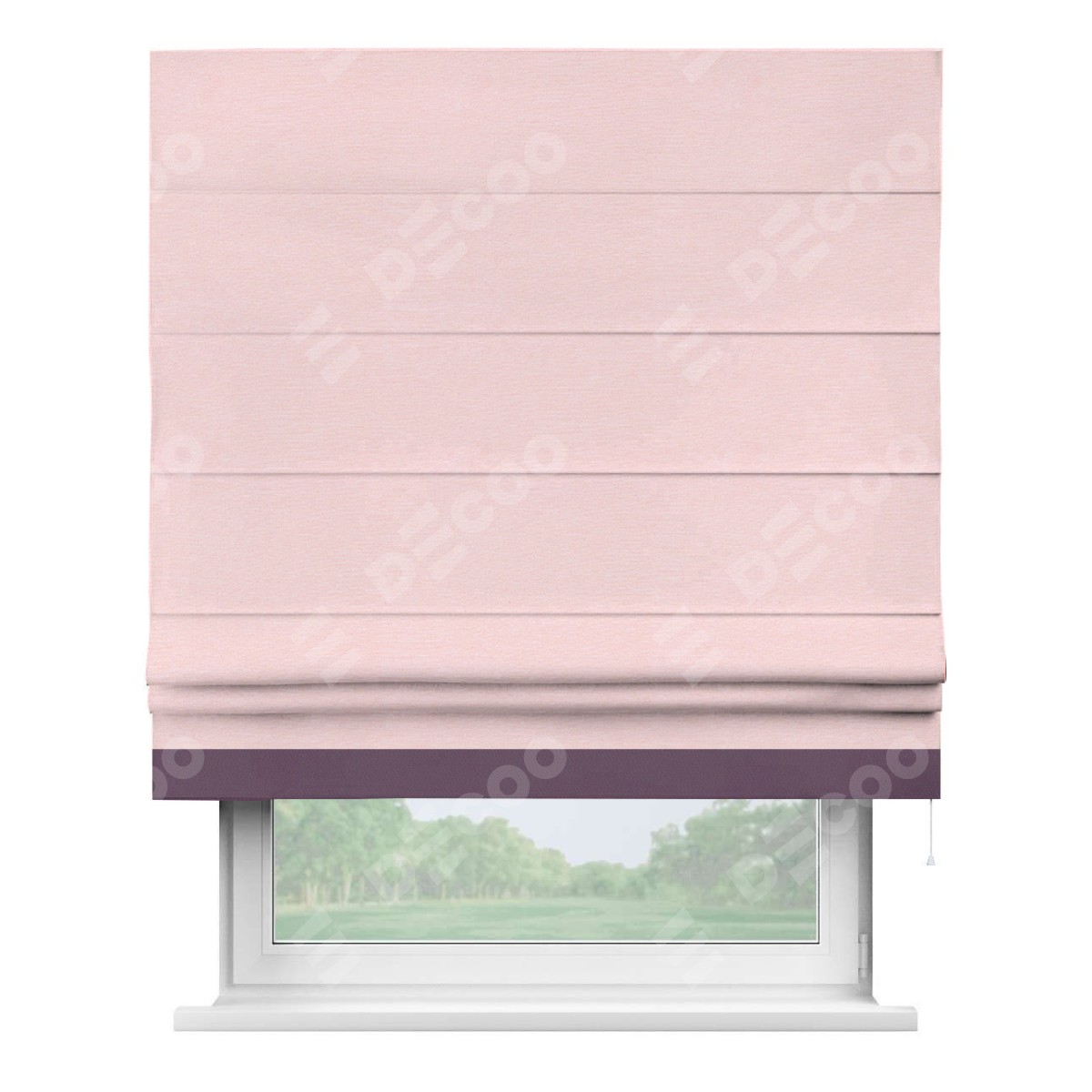 Римская штора производителя «Cortin», используется для проёма, пошита из ткани блэкаут однотонный розовый, артикул ткани 83046. Отделка шторы кантом «Джестер», ткань для канта используется из блэкаута однотонного разной расцветки на выбор. Имеет универсальный механизм и подходит для монтажа: на потолок, на стену и в нишу.