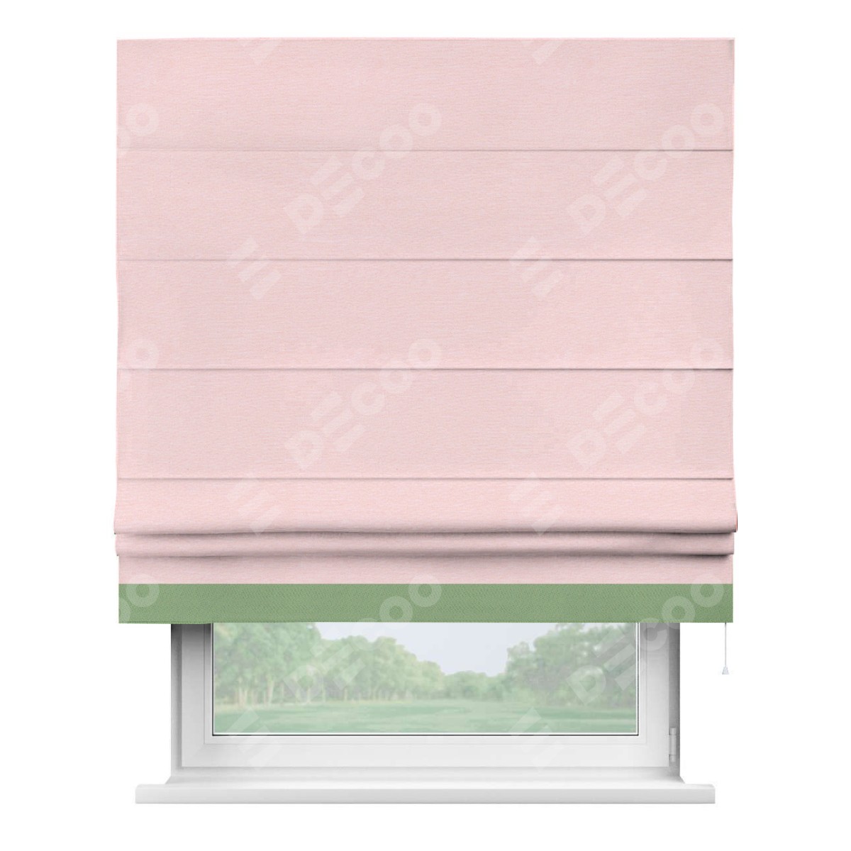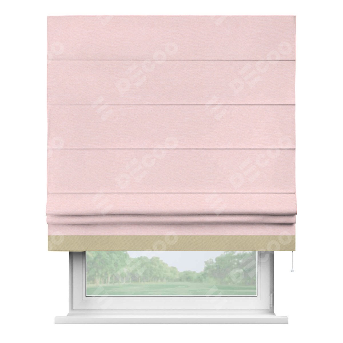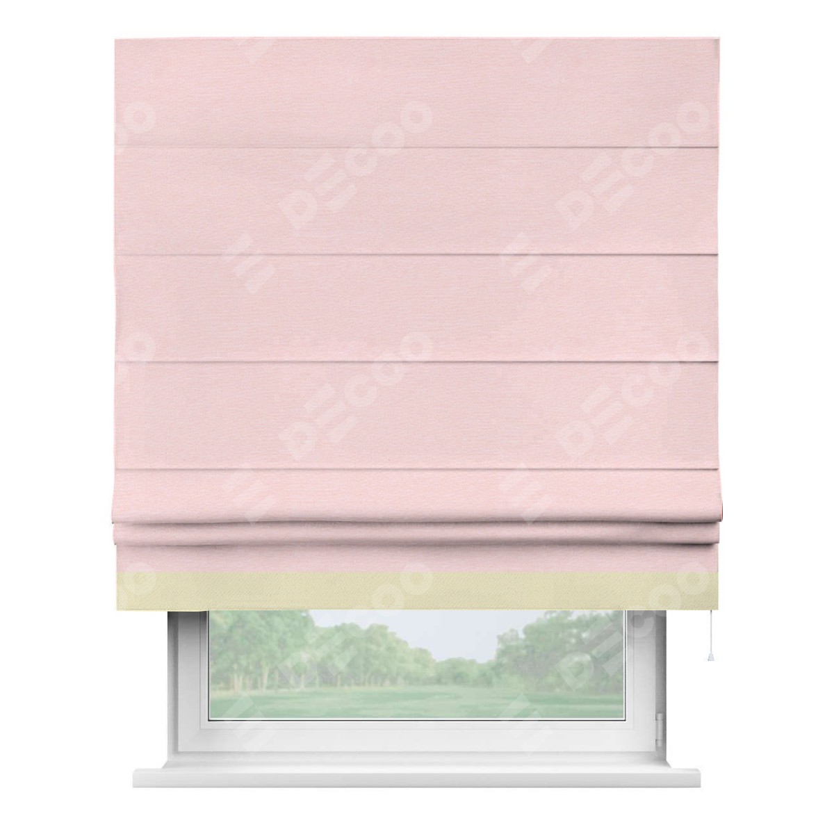 Римская штора производителя «Cortin», используется для проёма, пошита из ткани блэкаут однотонный розовый, артикул ткани 83046. Отделка шторы кантом «Джестер», ткань для канта используется из блэкаута однотонного разной расцветки на выбор. Имеет универсальный механизм и подходит для монтажа: на потолок, на стену и в нишу.
