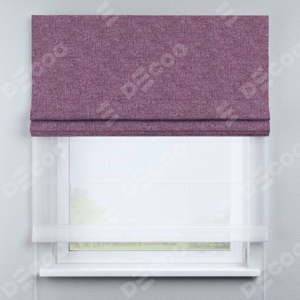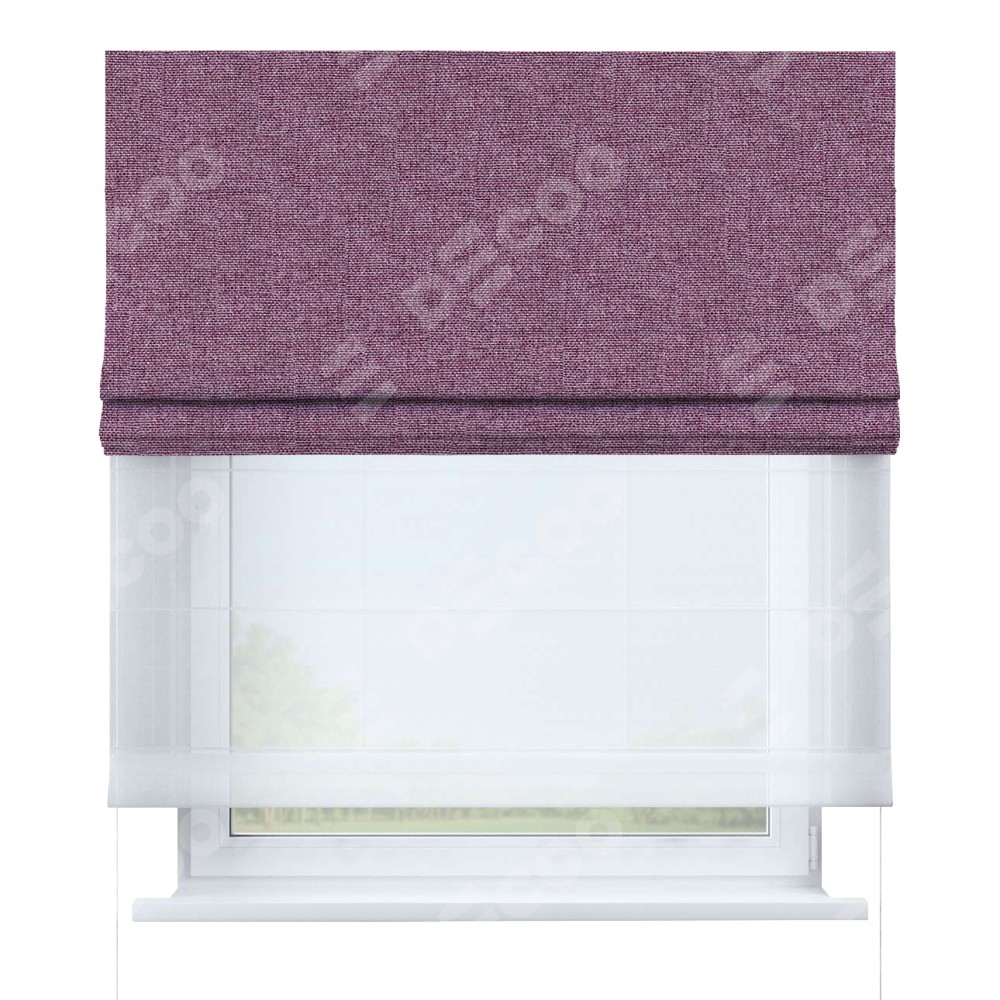 Римская штора день-ночь производителя «Cortin», используется для проёма, пошита из двух полотен, с лицевой стороны лён кашемир сиреневый артикул 21620, вторая ткань тюль (по стандарту комплектуется тюль белого цвета артикул V-01). Имеет универсальный механизм и подходит для монтажа: на потолок, на стену и в нишу.
