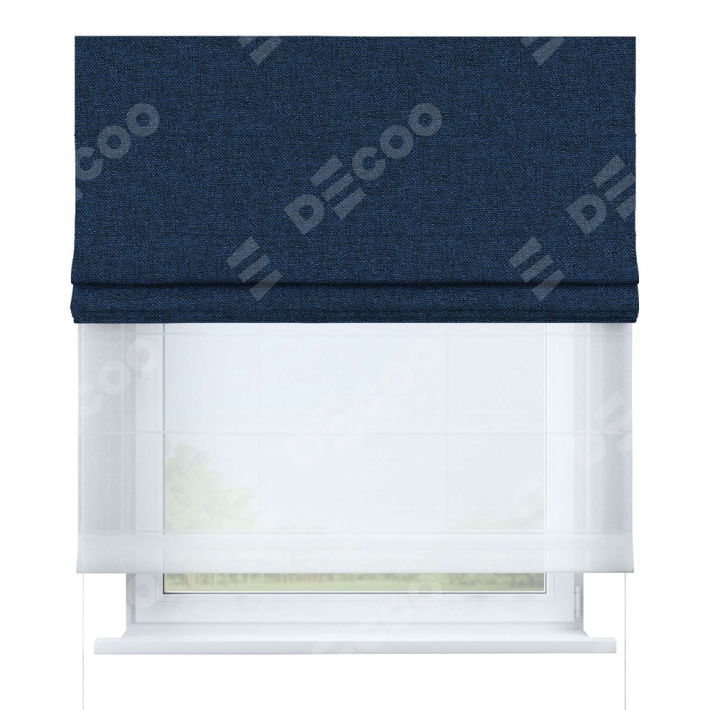 Римская штора день-ночь производителя «Cortin», используется для проёма, пошита из двух полотен, с лицевой стороны лён кашемир тёмно-синий артикул 17215, вторая ткань тюль (по стандарту комплектуется тюль белого цвета артикул V-01). Имеет универсальный механизм и подходит для монтажа: на потолок, на стену и в нишу.
