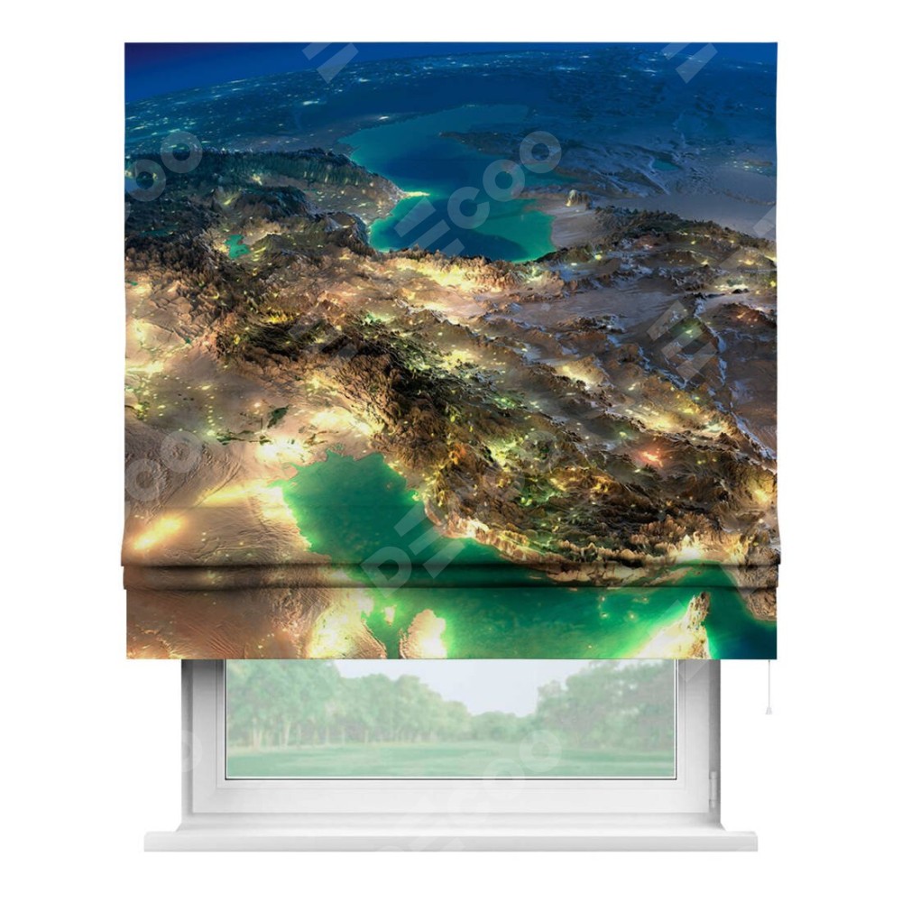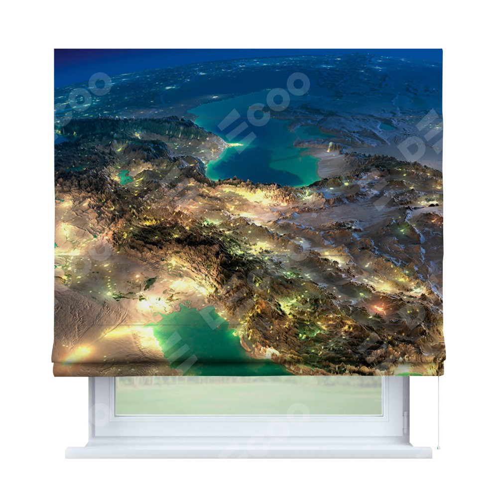 Римская штора производителя «Cortin», используется для проёма, пошита из ткани блэкаут с нанесением сублимационной печати «Ночные огни». Имеет универсальный механизм и подходит для монтажа: на потолок, на стену и в нишу.