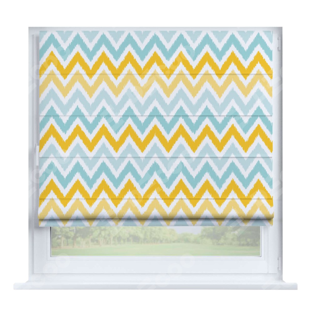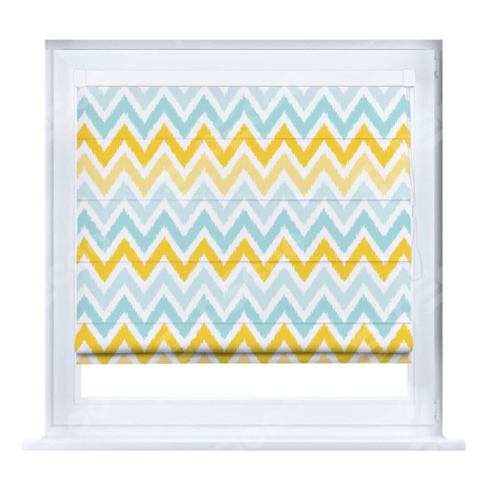 Римская штора производителя «Cortin», устанавливается на створку окна, пошита из ткани блэкаут с нанесением сублимационной печати «Икат шеврон». Штора шьётся по индивидуальным размерам, для данного типа римской шторы возможная ширина от 35 до 150 см., высота до 250 см.