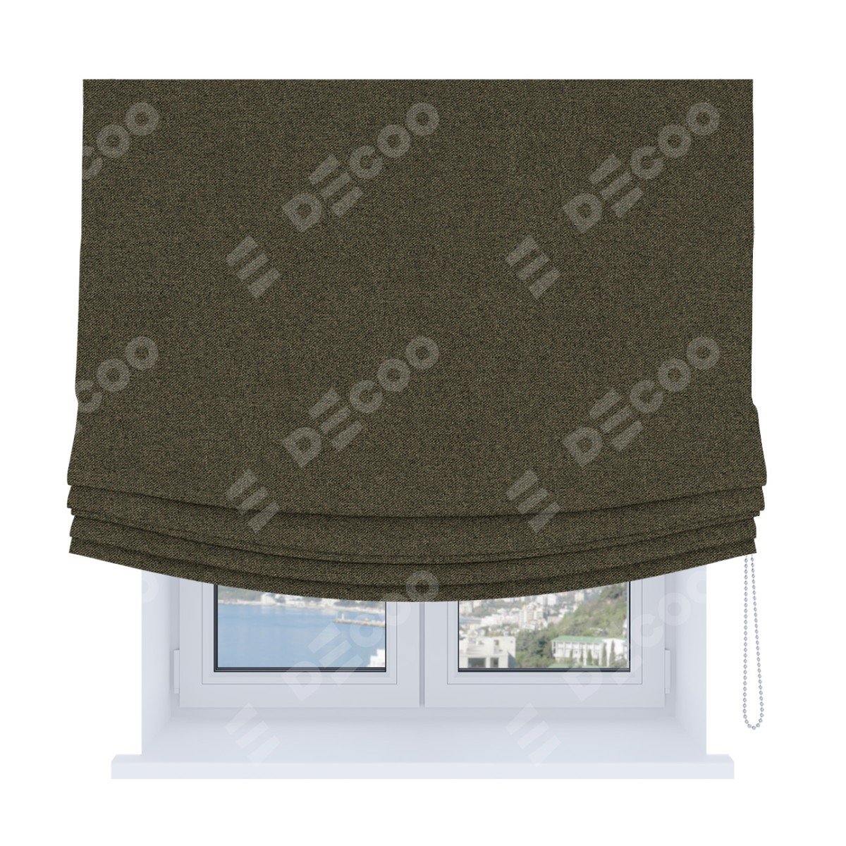 Римская штора Soft производителя «Cortin», используется для проёма, пошита из ткани лён блэкаут коричневый, артикул ткани 69383. Имеет универсальный механизм и подходит для монтажа: на потолок, на стену и в нишу. В отличие от стандартных римских штор, римская штора Soft не имеет горизонтальных вставок и нижнего отвеса. Это позволяет ткани произвольно драпироваться в свободные мягкие складки.