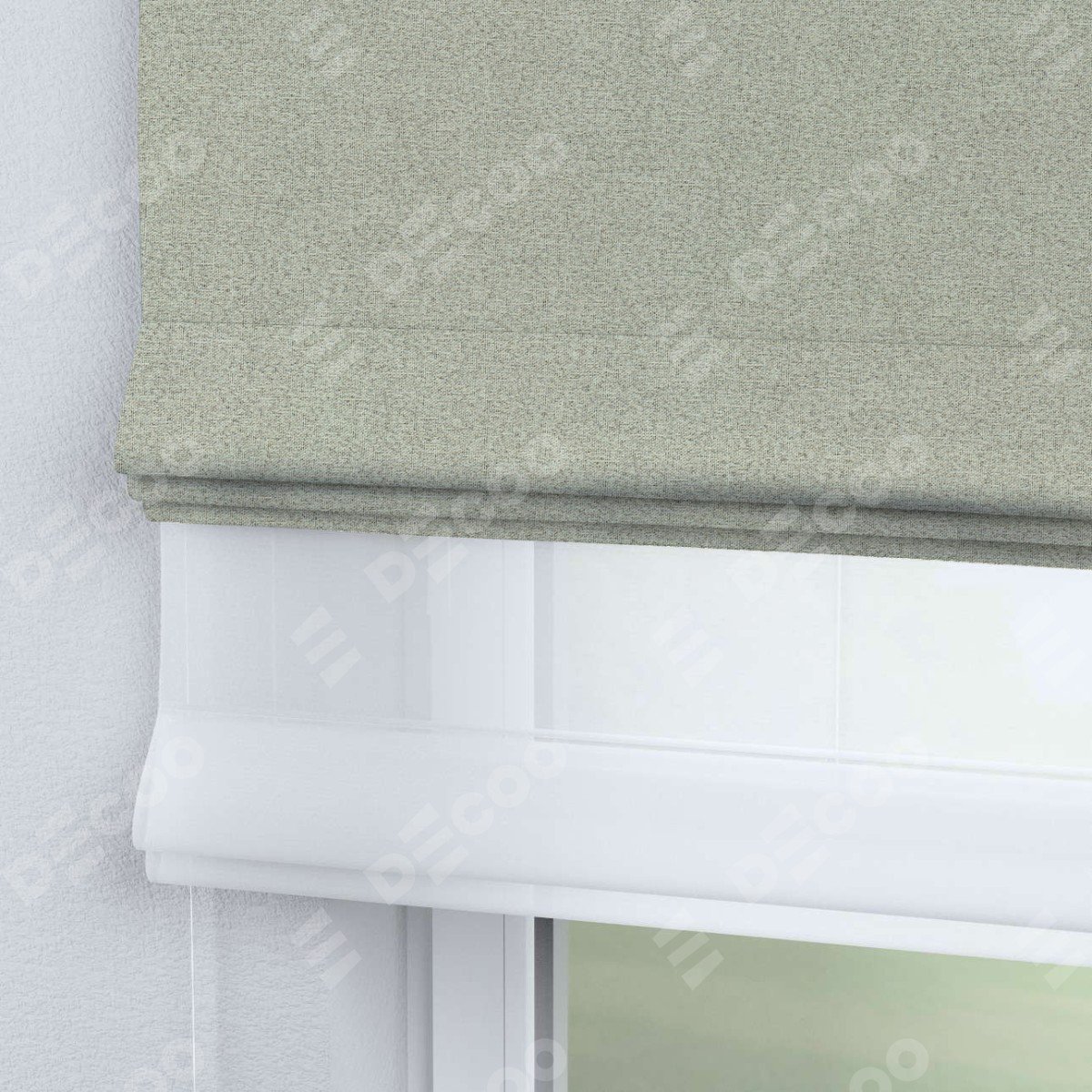 Римская штора день-ночь производителя «Cortin», используется для проёма, пошита из двух полотен, с лицевой стороны лён блэкаут серо-бежевый артикул 69450, вторая ткань тюль (по стандарту комплектуется тюль белого цвета артикул V-01). Имеет универсальный механизм и подходит для монтажа: на потолок, на стену и в нишу.