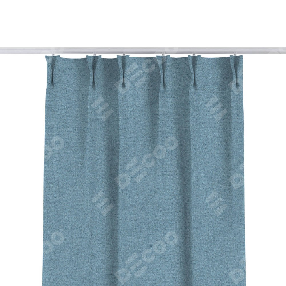 Комплект прямых штор, от производителя «Cortin», пошиты из ткани лён блэкаут голубой, артикул ткани 69574. С изнаночной стороны в верхней части штор пристрачивается шторная лента с декоративными складками «Кустик». Для создания элегантных складок прямые шторы шьются по стандарту с коэффициентом 1:2 (на 100 см. ширины проёма 200 см. ширины ткани).