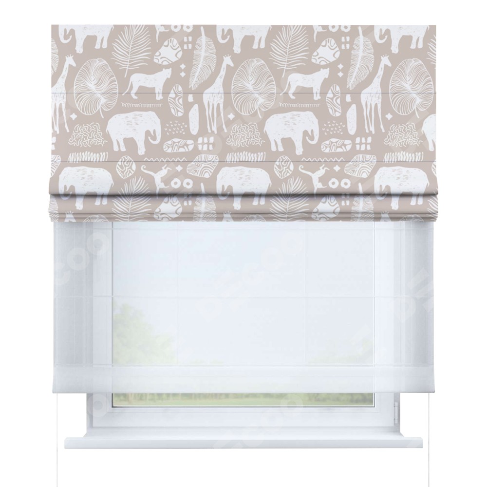 Римская штора день-ночь производителя «Cortin», используется для проёма, пошита из двух полотен, с лицевой блэкаут с нанесением сублимационной печати «Африканские животные», вторая ткань тюль (по стандарту комплектуется тюль белого цвета артикул V-01). Имеет универсальный механизм и подходит для монтажа: на потолок, на стену и в нишу.