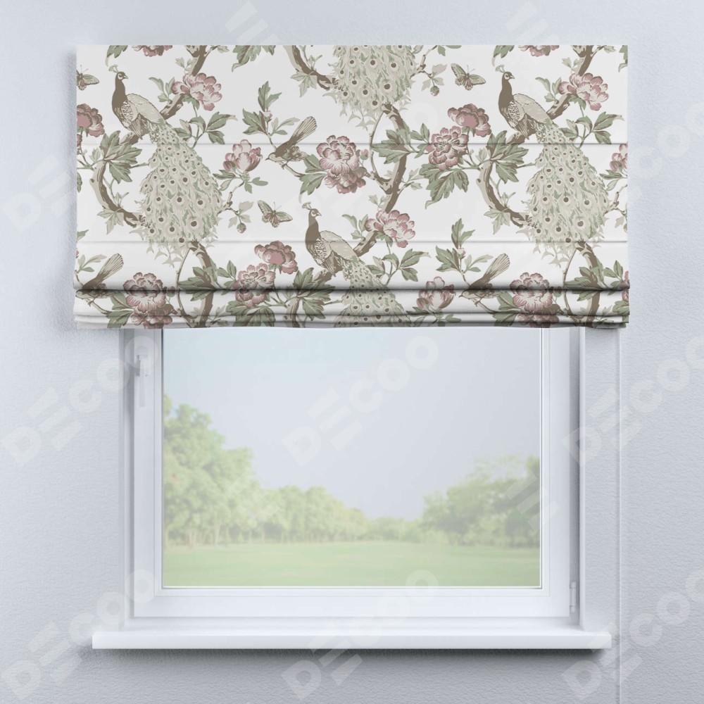 Римская штора производителя «Cortin», используется для проёма, пошита из ткани блэкаут с нанесением сублимационной печати «Гордые павлины». Имеет универсальный механизм и подходит для монтажа: на потолок, на стену и в нишу.
