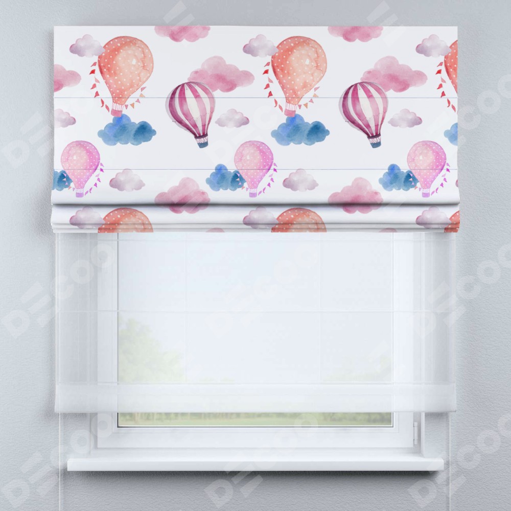 Римская штора день-ночь производителя «Cortin», используется для проёма, пошита из двух полотен, с лицевой блэкаут с нанесением сублимационной печати «Полёт в облаках», вторая ткань тюль (по стандарту комплектуется тюль белого цвета артикул V-01). Имеет универсальный механизм и подходит для монтажа: на потолок, на стену и в нишу.