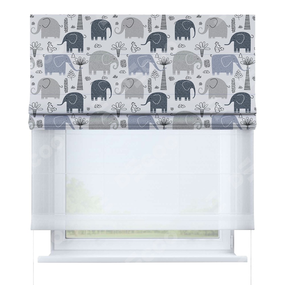 Римская штора день-ночь производителя «Cortin», используется для проёма, пошита из двух полотен, с лицевой блэкаут с нанесением сублимационной печати «Серые слоники», вторая ткань тюль (по стандарту комплектуется тюль белого цвета артикул V-01). Имеет универсальный механизм и подходит для монтажа: на потолок, на стену и в нишу.