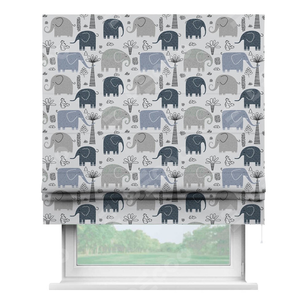 Римская штора производителя «Cortin», используется для проёма, пошита из ткани блэкаут с нанесением сублимационной печати «Серые слоники». Имеет универсальный механизм и подходит для монтажа: на потолок, на стену и в нишу.