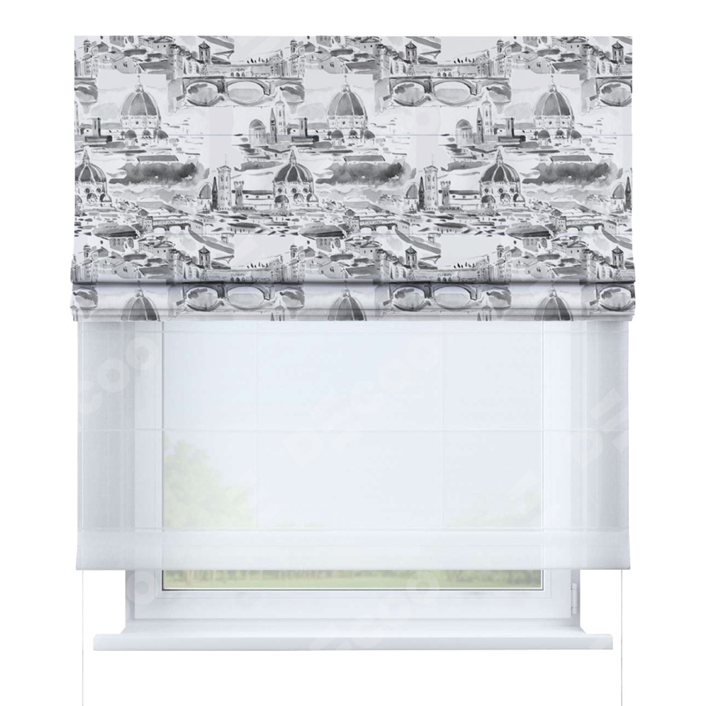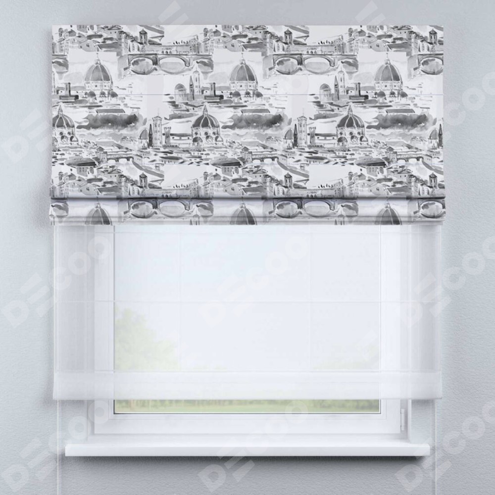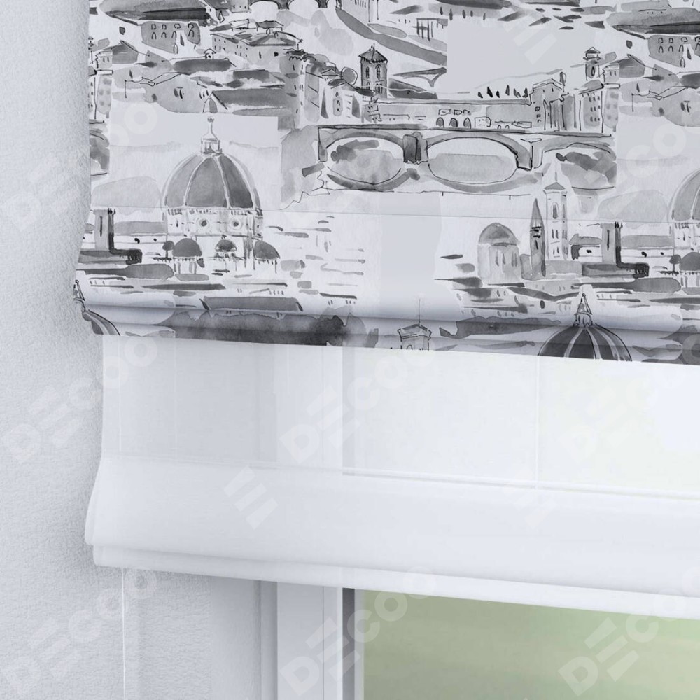 Римская штора день-ночь производителя «Cortin», используется для проёма, пошита из двух полотен, с лицевой блэкаут с нанесением сублимационной печати «Старый город», вторая ткань тюль (по стандарту комплектуется тюль белого цвета артикул V-01). Имеет универсальный механизм и подходит для монтажа: на потолок, на стену и в нишу.