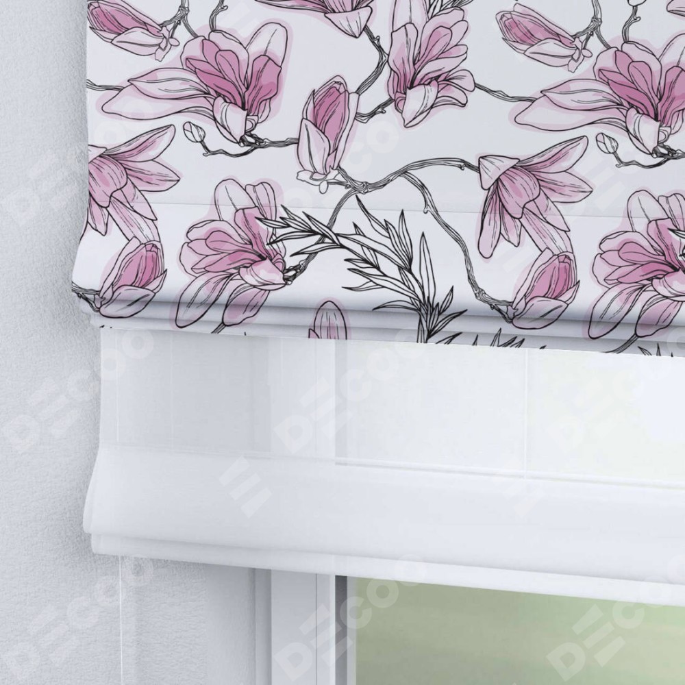 Римская штора день-ночь производителя «Cortin», используется для проёма, пошита из двух полотен, с лицевой блэкаут с нанесением сублимационной печати «Цветки магнолии», вторая ткань тюль (по стандарту комплектуется тюль белого цвета артикул V-01). Имеет универсальный механизм и подходит для монтажа: на потолок, на стену и в нишу.
