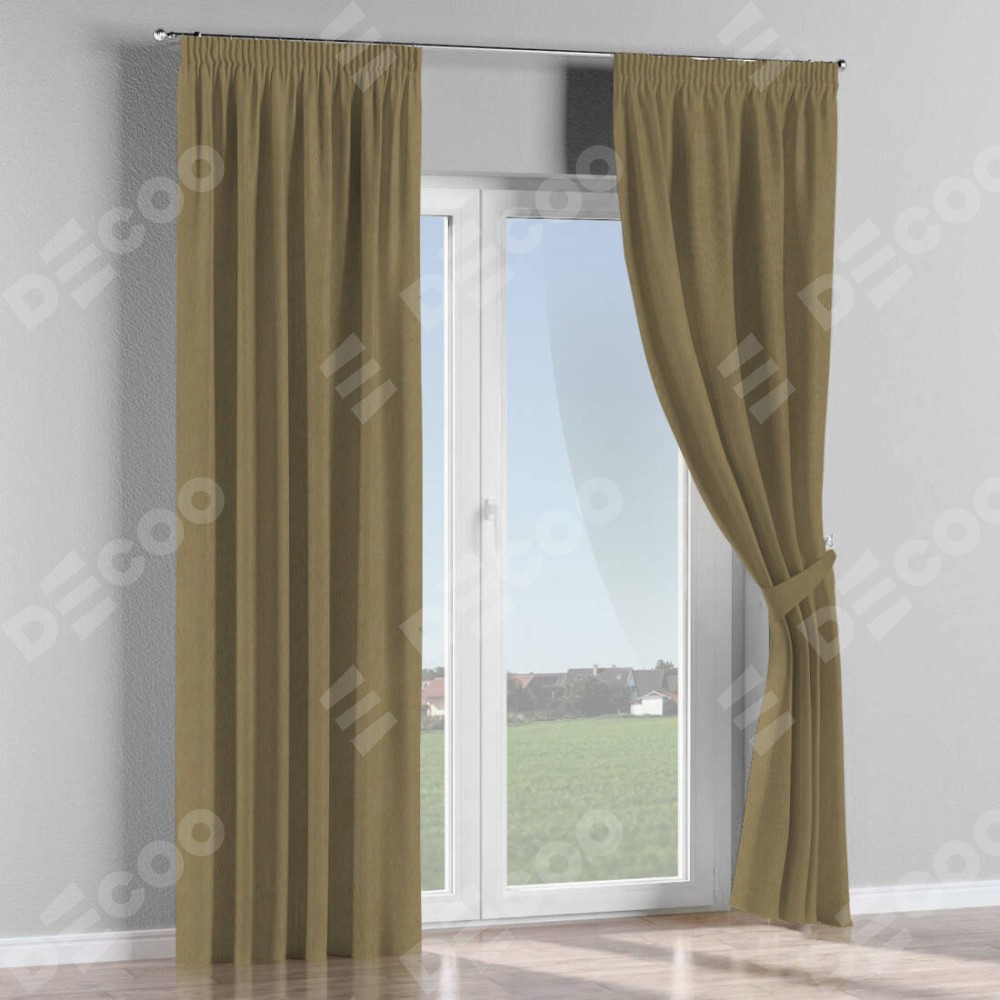 Комплект прямых штор, от производителя «Cortin», пошиты из ткани блэкаут однотонный бежево-золотой, артикул ткани 12095−2. С изнаночной стороны в верхней части штор пристрачивается шторная лента с декоративными складками «Карандаш». Для создания элегантных складок прямые шторы шьются по стандарту с коэффициентом 1:2 (на 100 см. ширины проёма 200 см. ширины ткани).