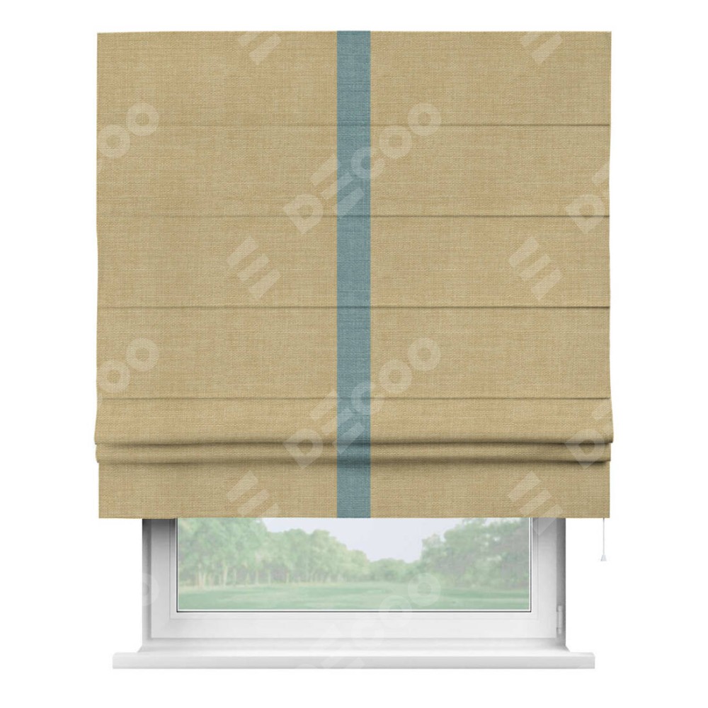 Римская штора производителя «Cortin», используется для проёма, пошита из ткани лён бежевый, артикул 7442. Отделка шторы кантом «Хайвэй», ткань для канта используется из льна разной расцветки на выбор. Имеет универсальный механизм и подходит для монтажа: на потолок, на стену и в нишу.