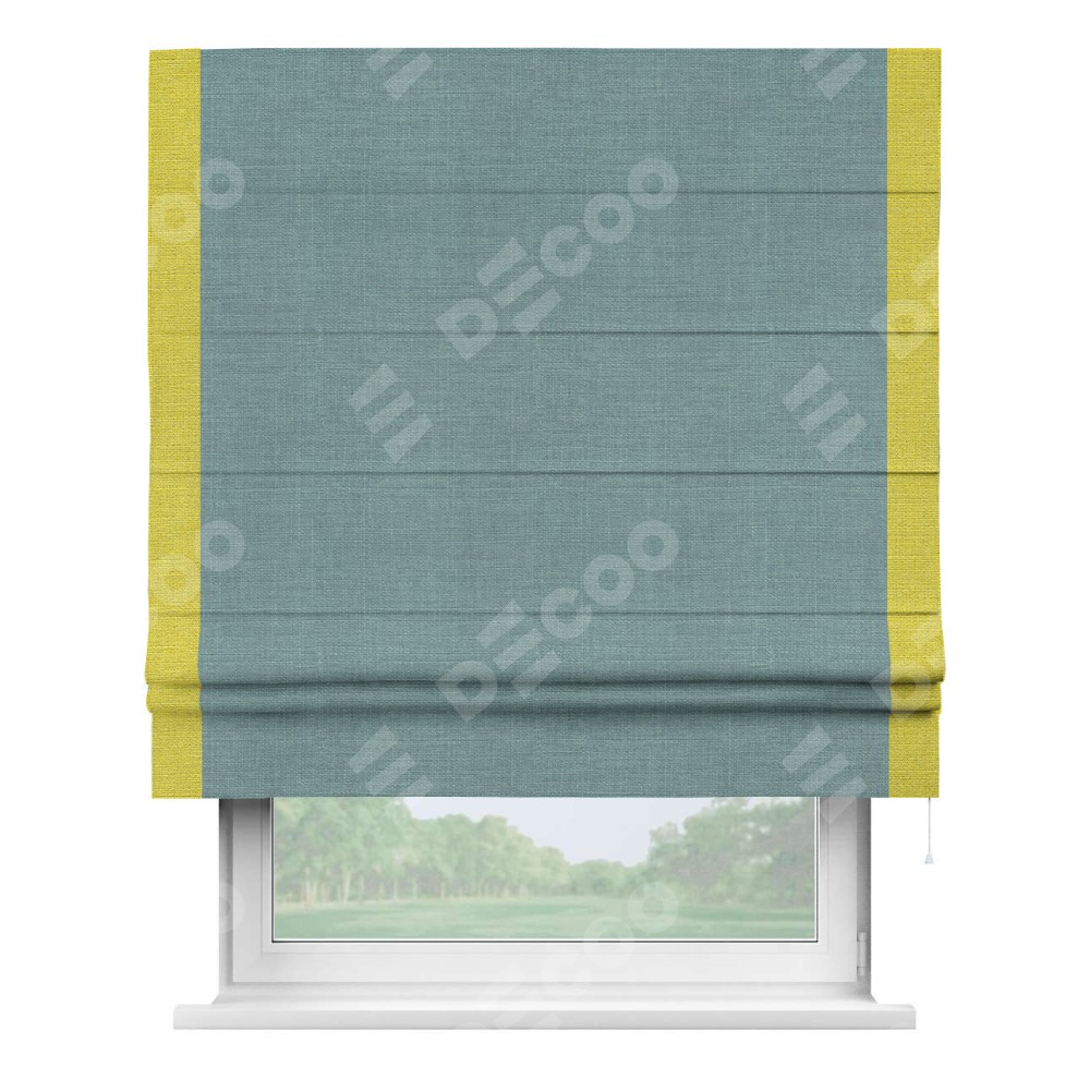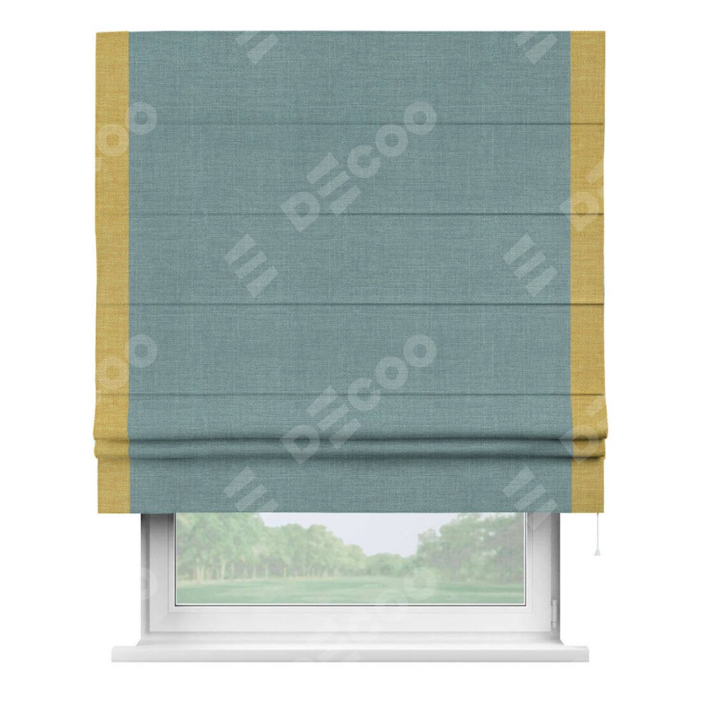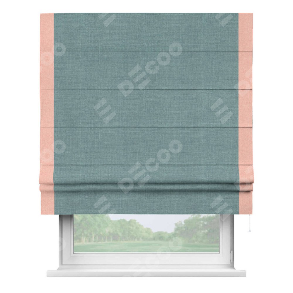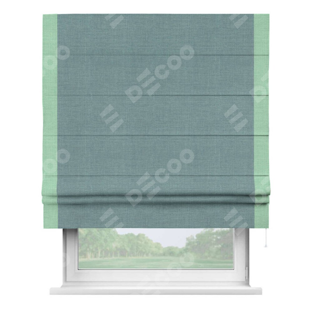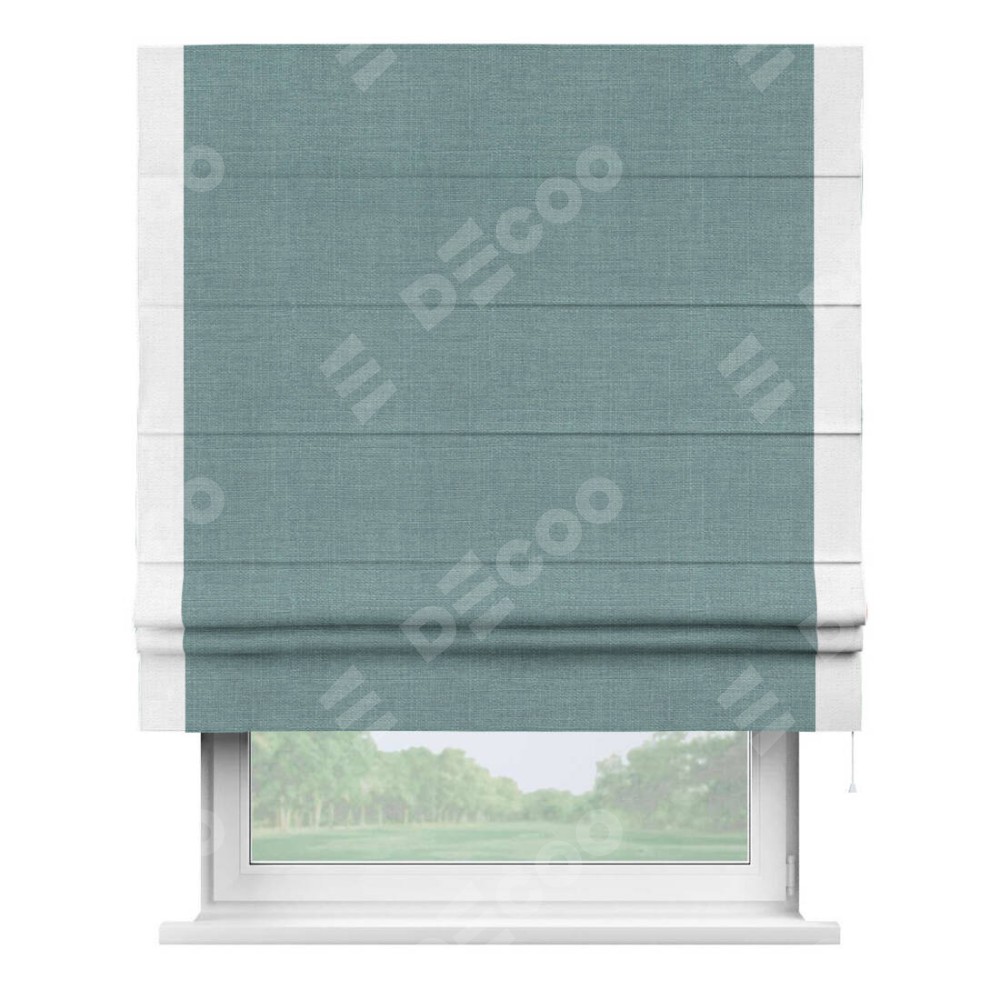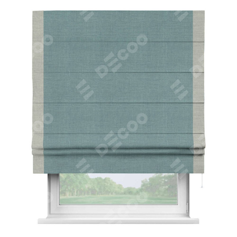 Римская штора производителя «Cortin», используется для проёма, пошита из ткани лён голубой, артикул 74736. Отделка шторы кантом «Стрим Дуо», ткань для канта используется из льна разной расцветки на выбор. Имеет универсальный механизм и подходит для монтажа: на потолок, на стену и в нишу.