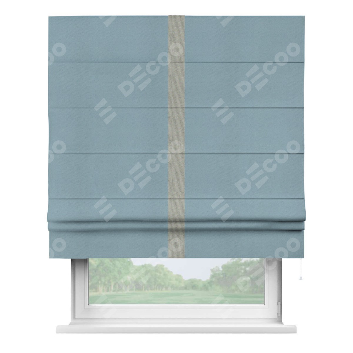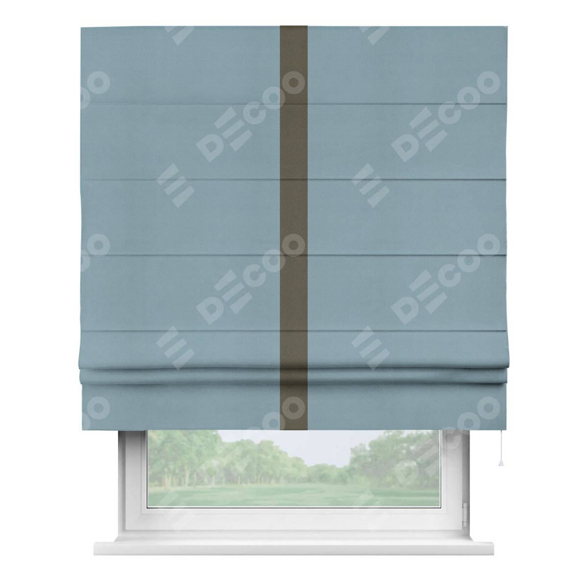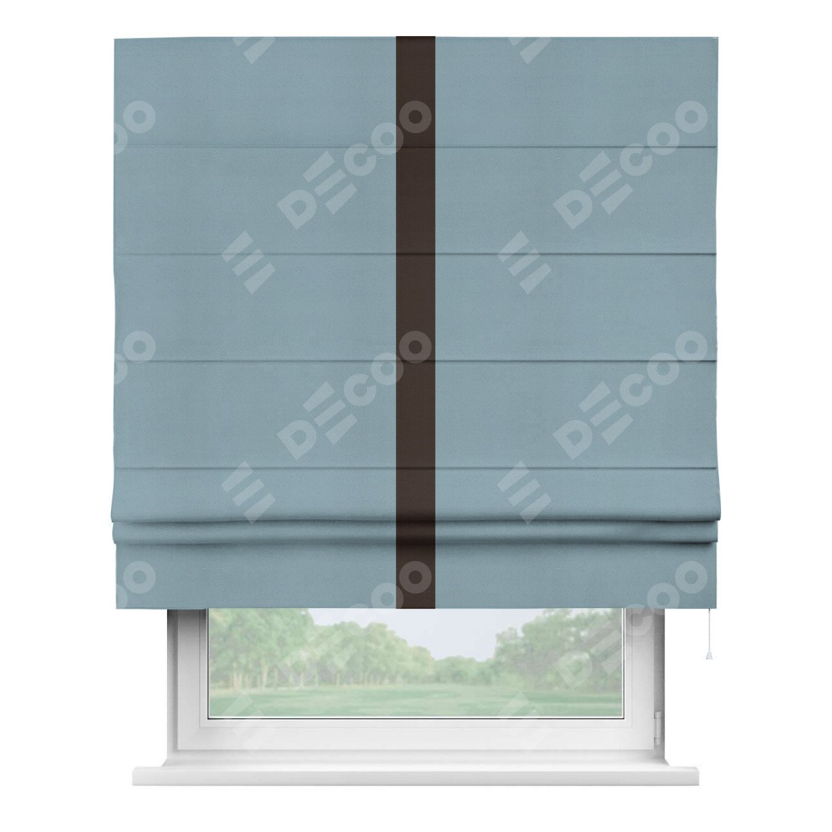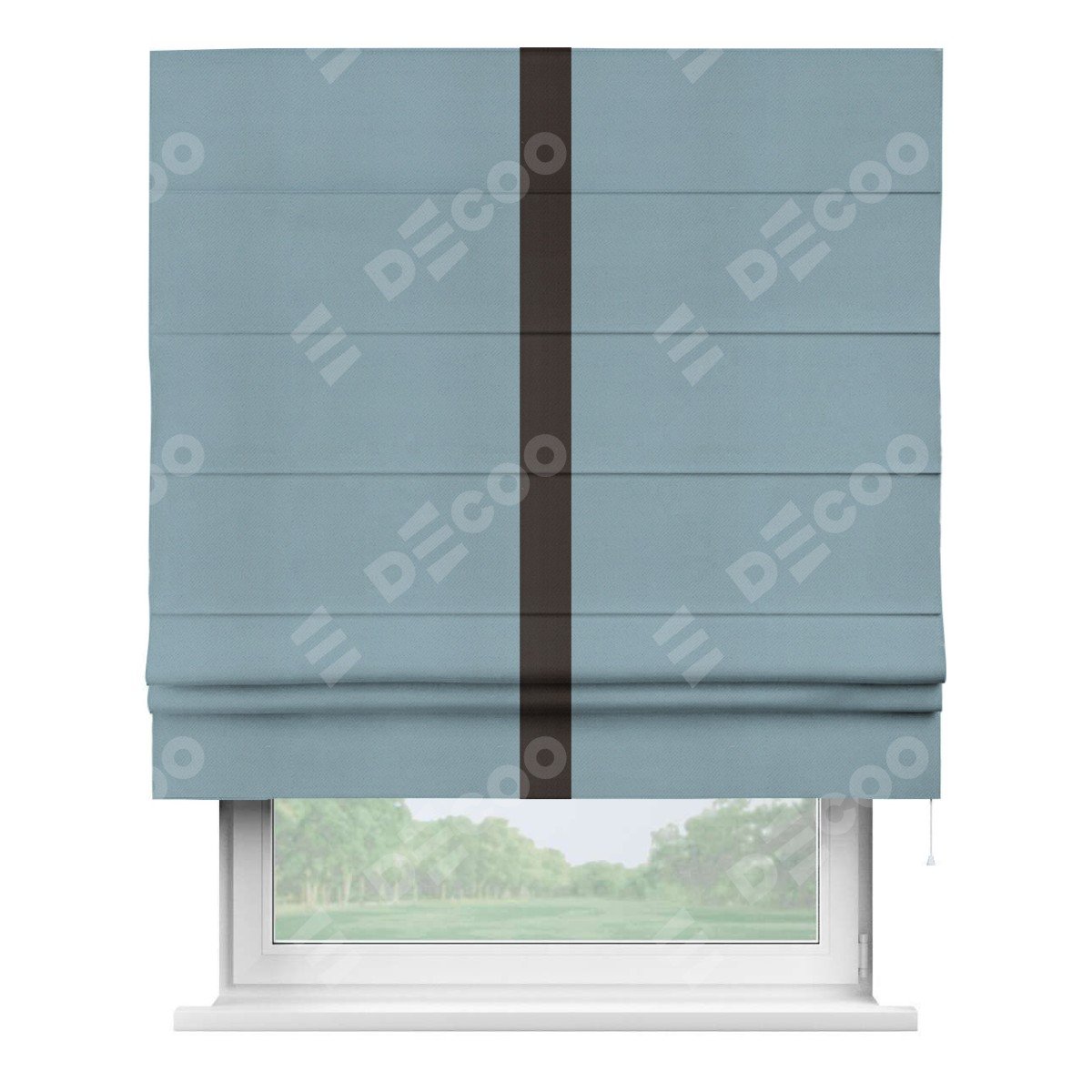 Римская штора производителя «Cortin», используется для проёма, пошита из ткани блэкаут однотонный серо-голубой, артикул ткани 29327−2. Отделка шторы кантом «Хайвей», ткань для канта используется из блэкаута однотонного разной расцветки на выбор. Имеет универсальный механизм и подходит для монтажа: на потолок, на стену и в нишу.