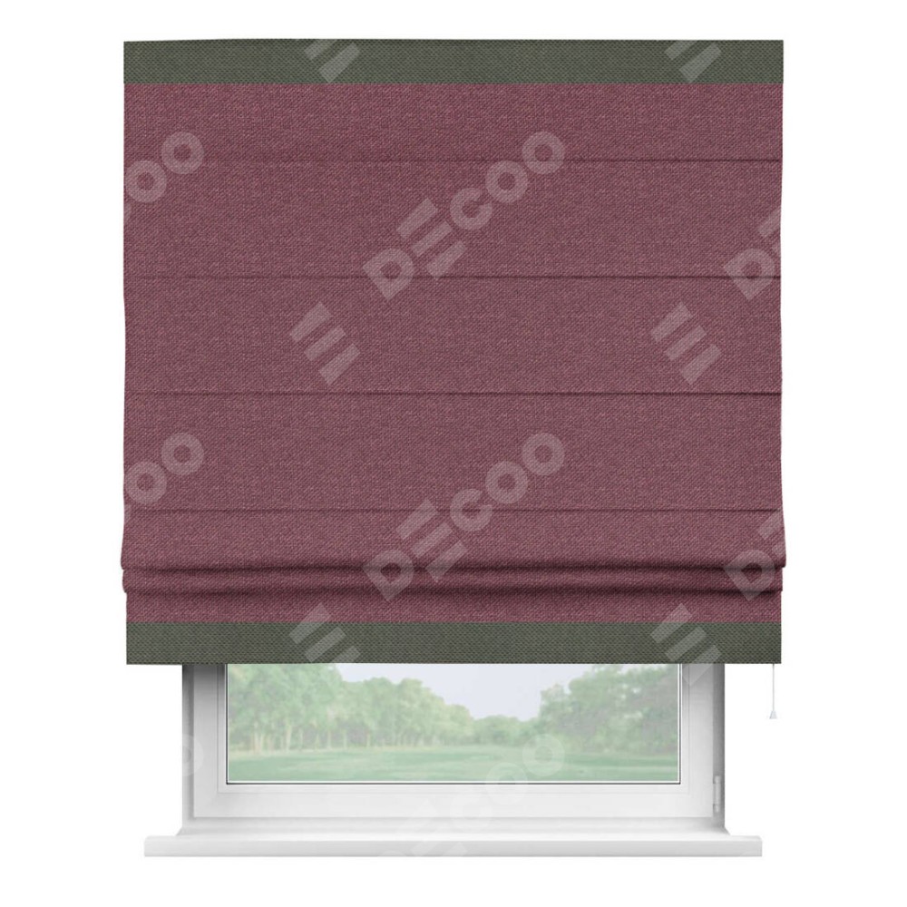 Римская штора производителя «Cortin», используется для проёма, пошита из ткани лён димаут марсала, артикул 1602. Отделка шторы кантом «Горизонт», ткань для канта используется из льна димаут разной расцветки на выбор. Имеет универсальный механизм и подходит для монтажа: на потолок, на стену и в нишу.