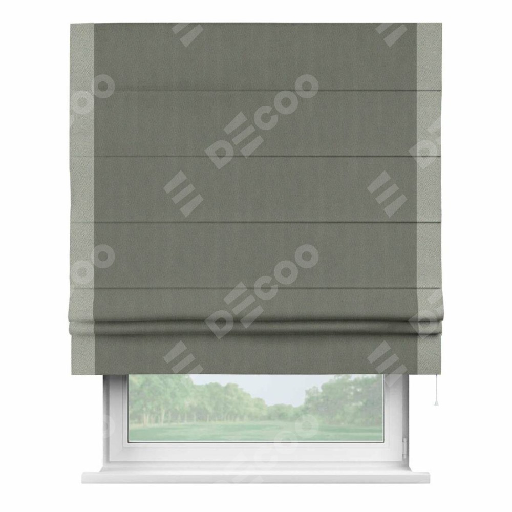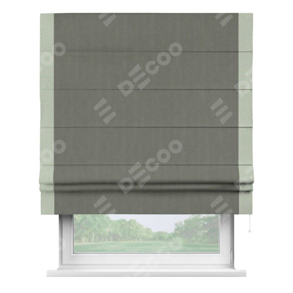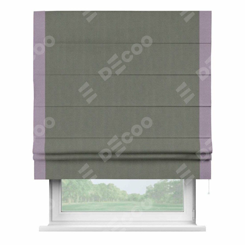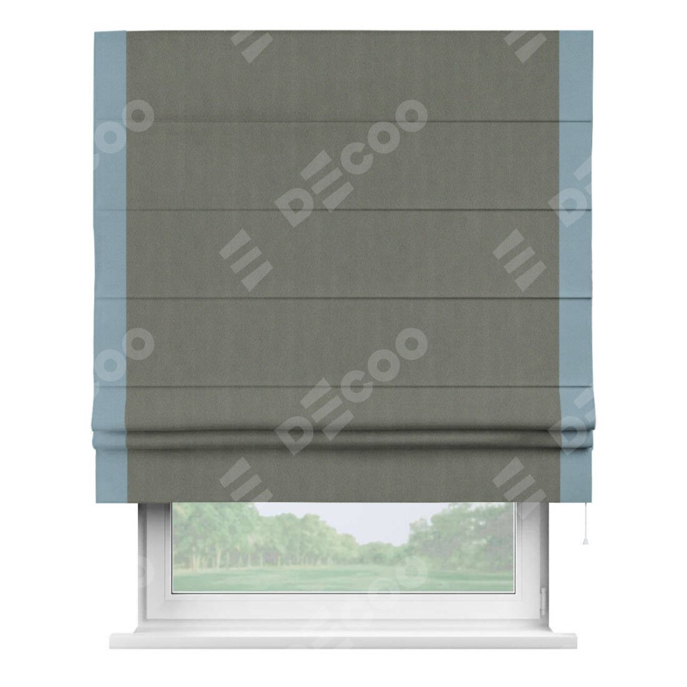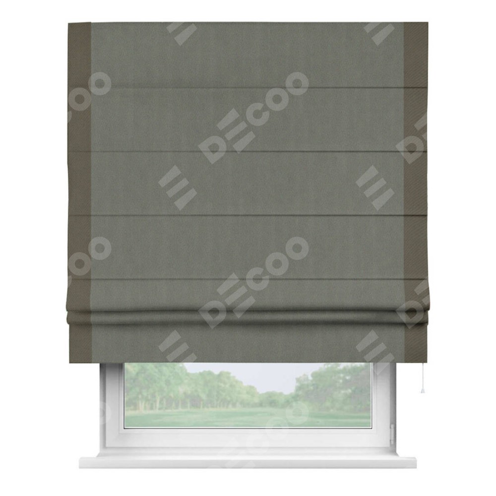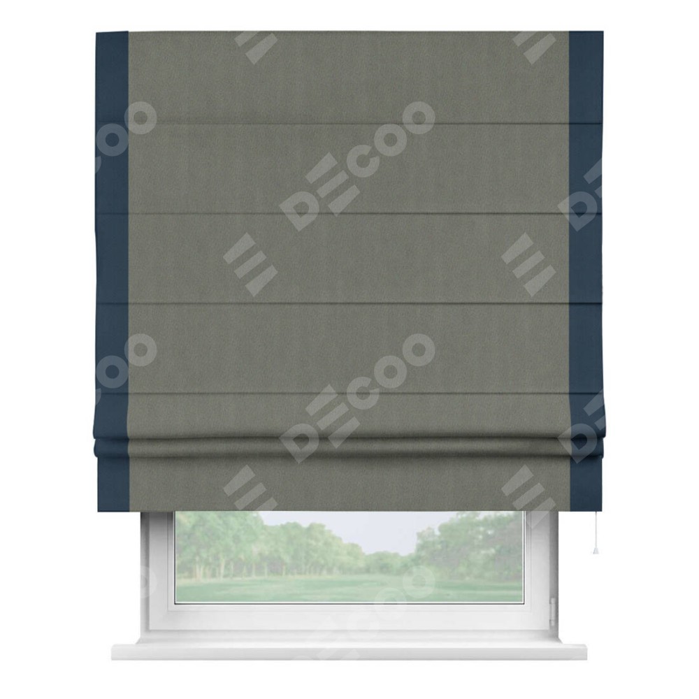 Римская штора производителя «Cortin», используется для проёма, пошита из ткани блэкаут однотонный тёмно-серый, артикул ткани 29332−1. Отделка шторы кантом «Стрим Дуо», ткань для канта используется из блэкаута однотонного разной расцветки на выбор. Имеет универсальный механизм и подходит для монтажа: на потолок, на стену и в нишу.