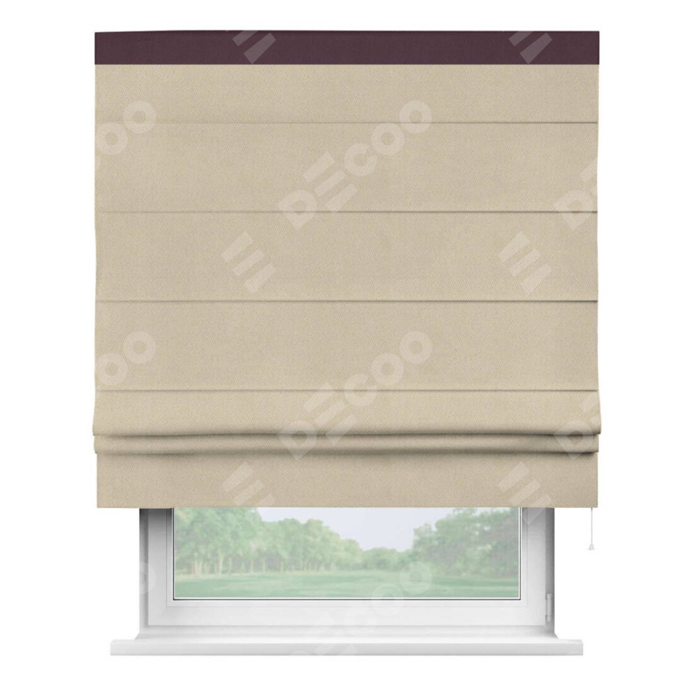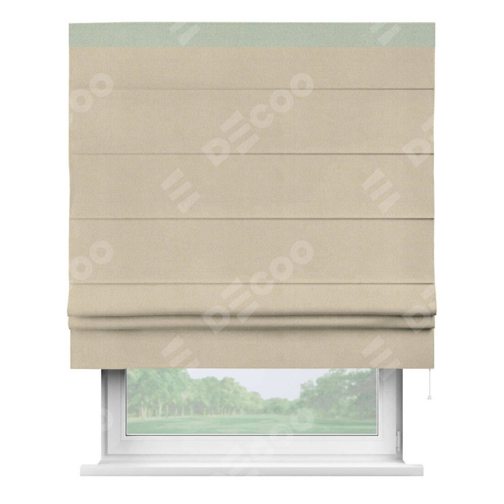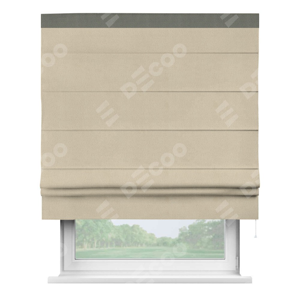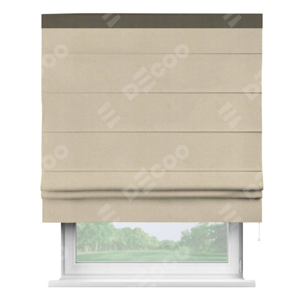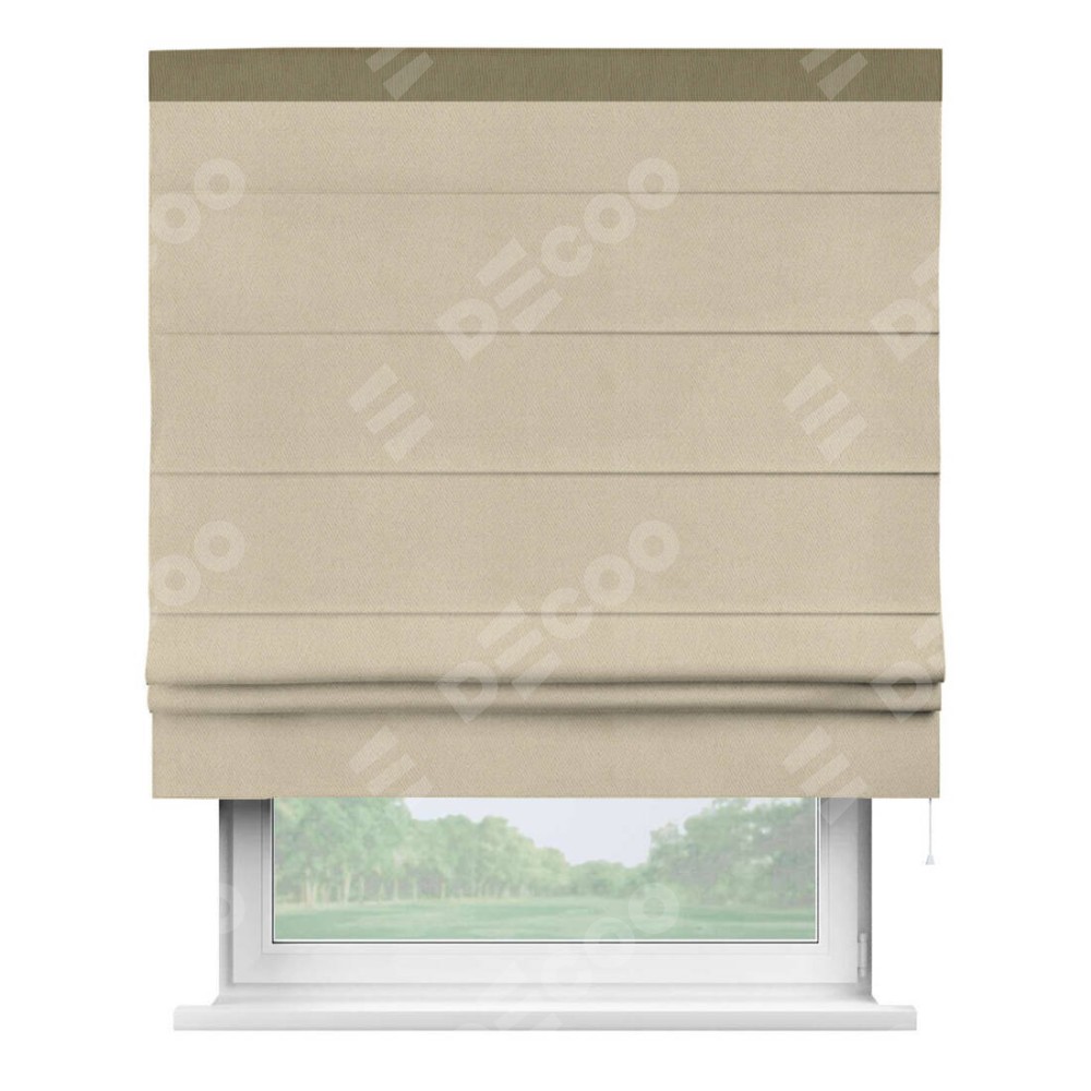 Римская штора производителя «Cortin», используется для проёма, пошита из ткани блэкаут однотонный кофейно-бежевый, артикул ткани 12095−1. Отделка шторы кантом «Кинг», ткань для канта используется из блэкаута однотонного разной расцветки на выбор. Имеет универсальный механизм и подходит для монтажа: на потолок, на стену и в нишу.