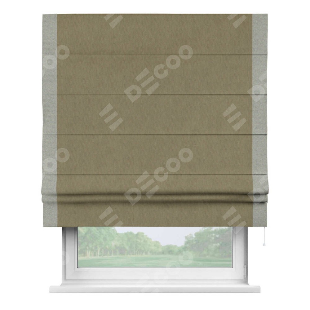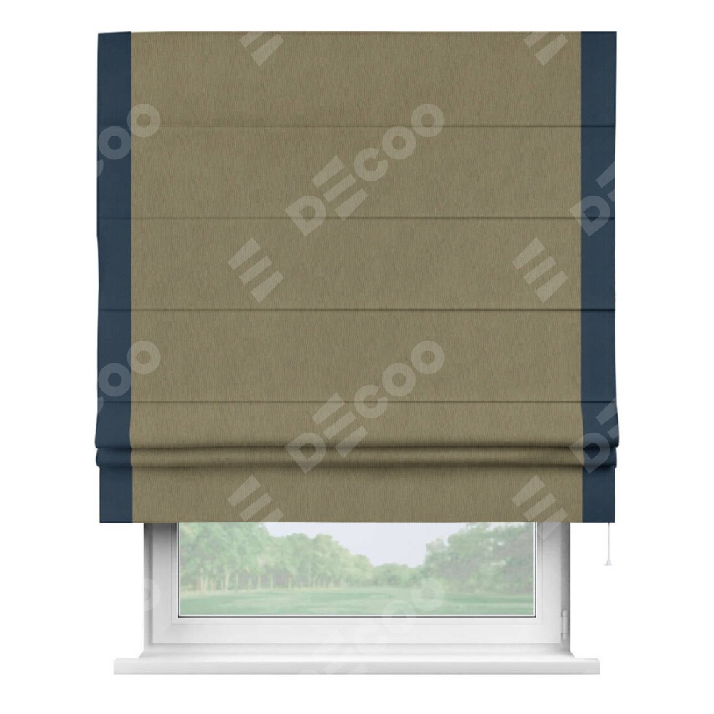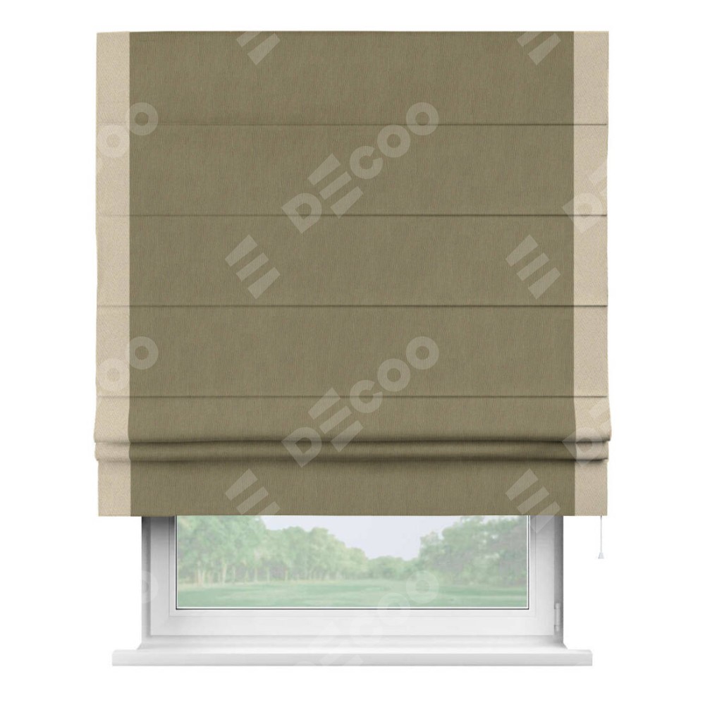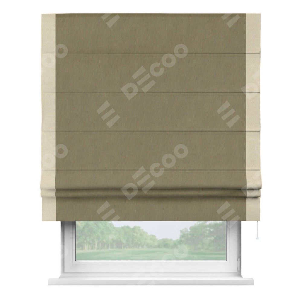 Римская штора производителя «Cortin», используется для проёма, пошита из ткани блэкаут однотонный бежево-золотой, артикул ткани 12095−2. Отделка шторы кантом «Стрим Дуо», ткань для канта используется из блэкаута однотонного разной расцветки на выбор. Имеет универсальный механизм и подходит для монтажа: на потолок, на стену и в нишу.