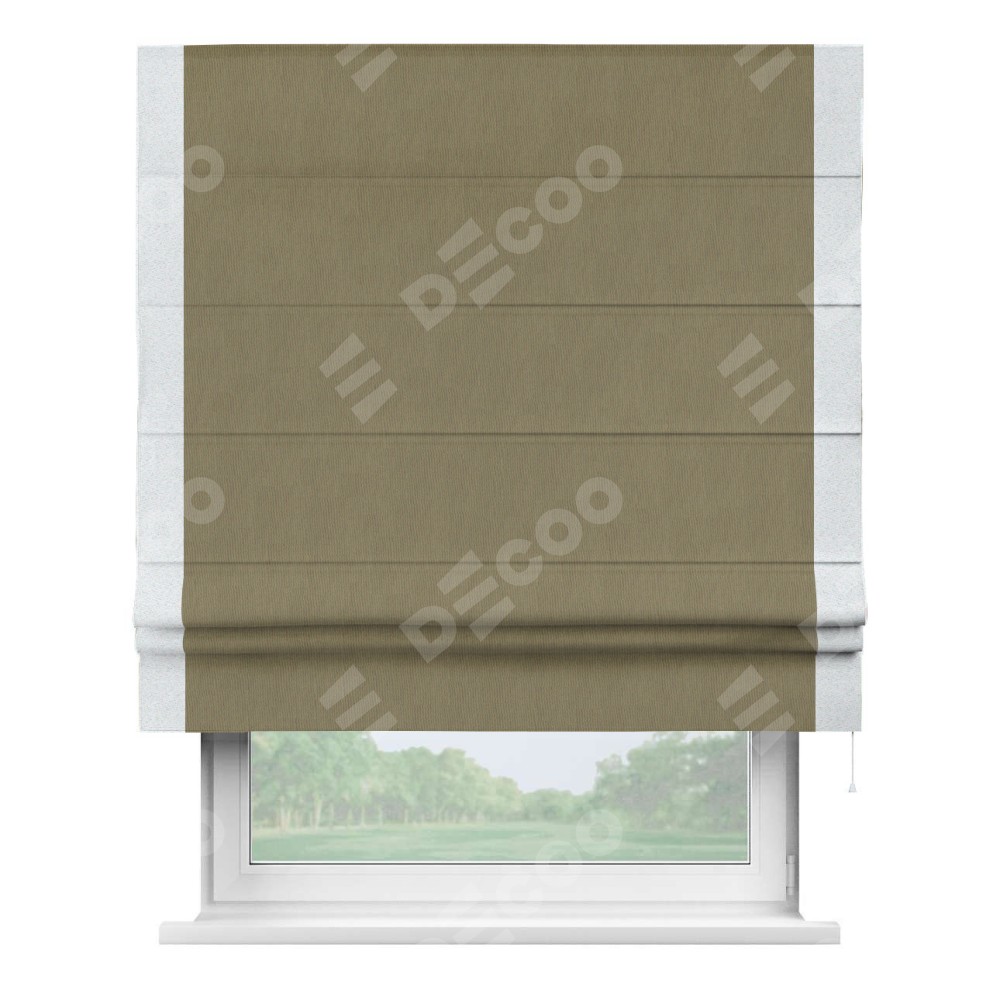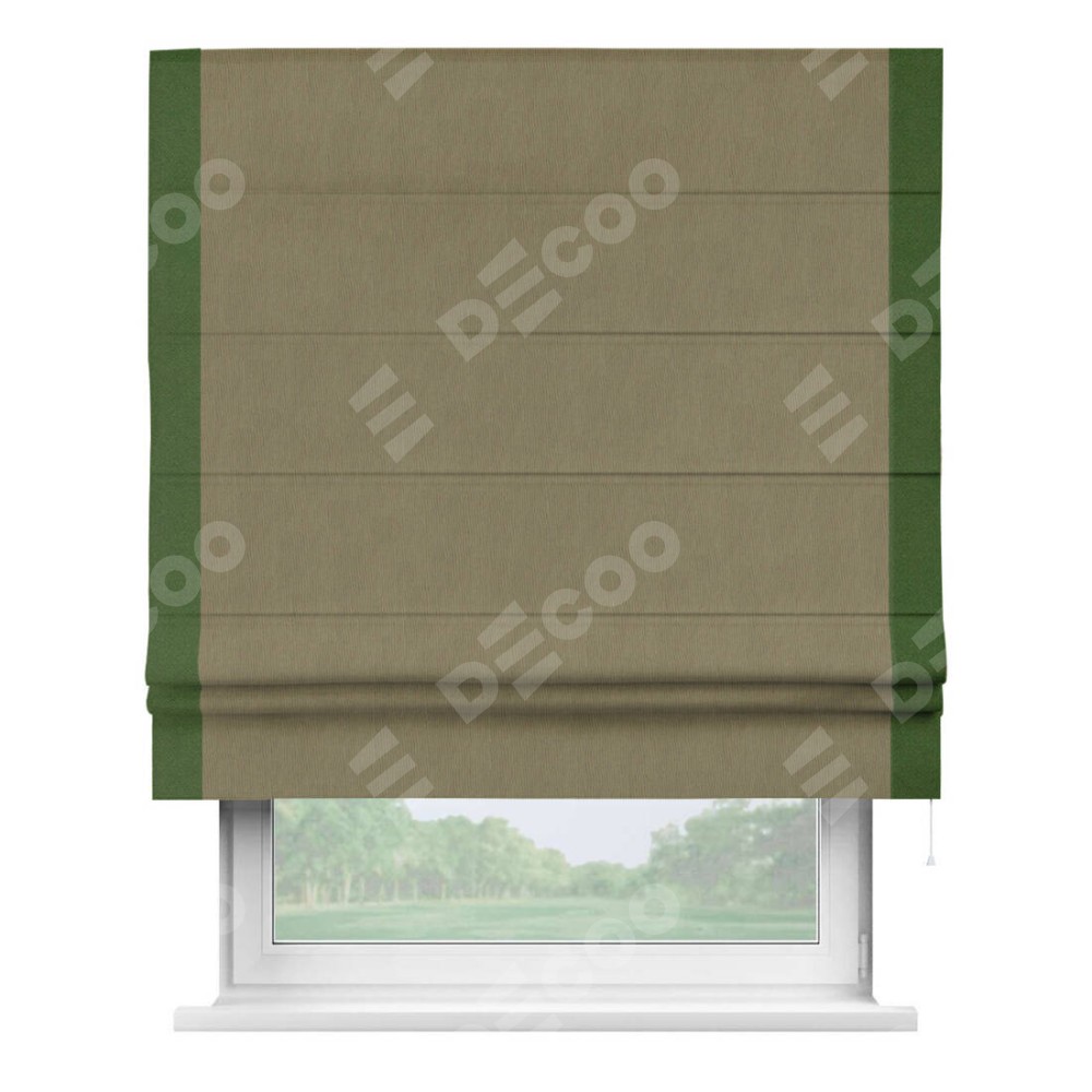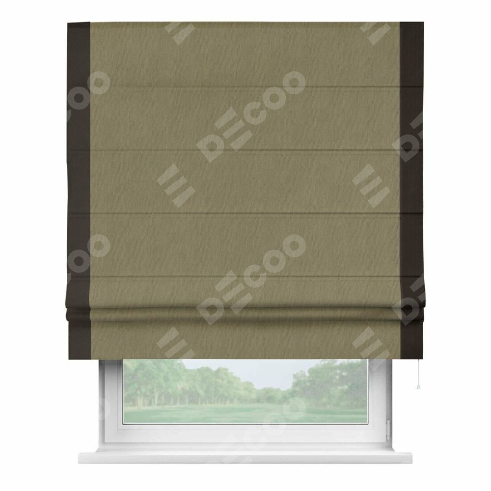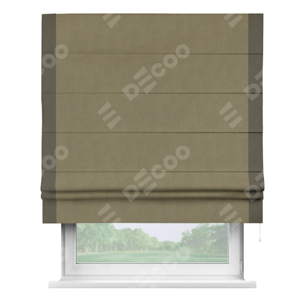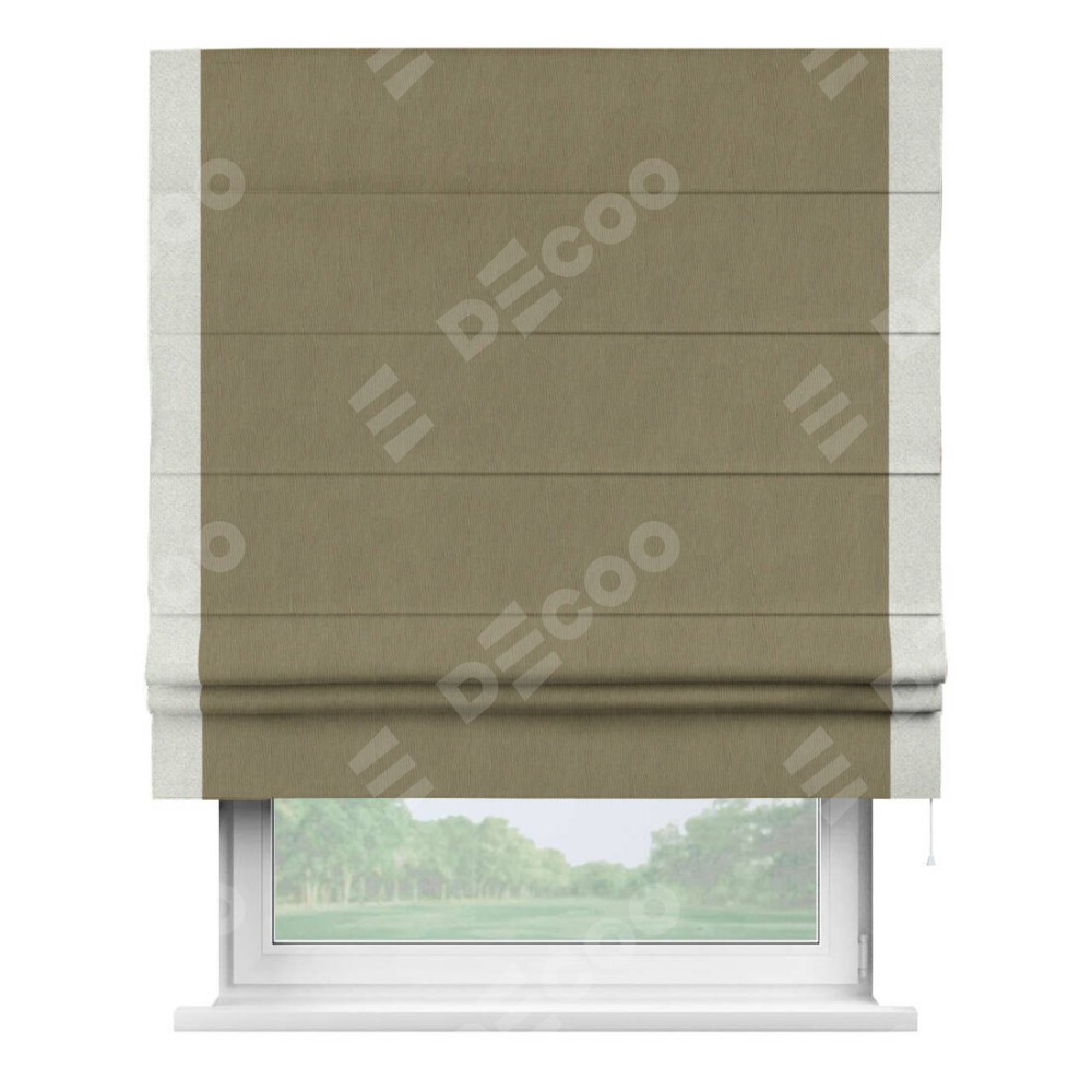 Римская штора производителя «Cortin», используется для проёма, пошита из ткани блэкаут однотонный бежево-золотой, артикул ткани 12095−2. Отделка шторы кантом «Стрим Дуо», ткань для канта используется из блэкаута однотонного разной расцветки на выбор. Имеет универсальный механизм и подходит для монтажа: на потолок, на стену и в нишу.