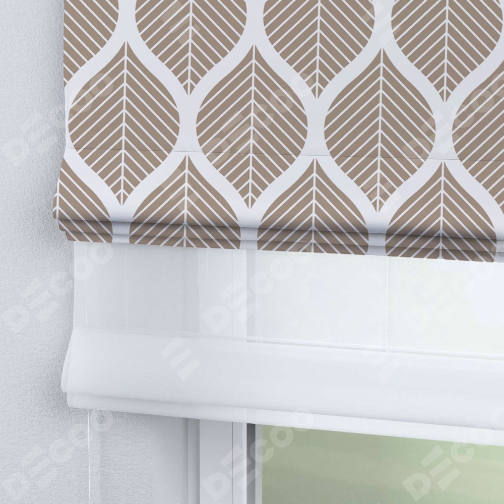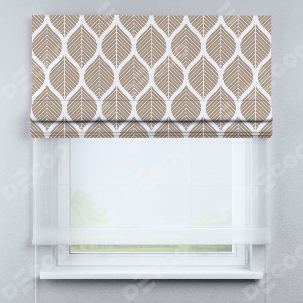 Римская штора день-ночь производителя «Cortin», используется для проёма, пошита из двух полотен, с лицевой блэкаут с нанесением сублимационной печати «Листья геометрия», вторая ткань тюль (по стандарту комплектуется тюль белого цвета артикул V-01). Имеет универсальный механизм и подходит для монтажа: на потолок, на стену и в нишу.