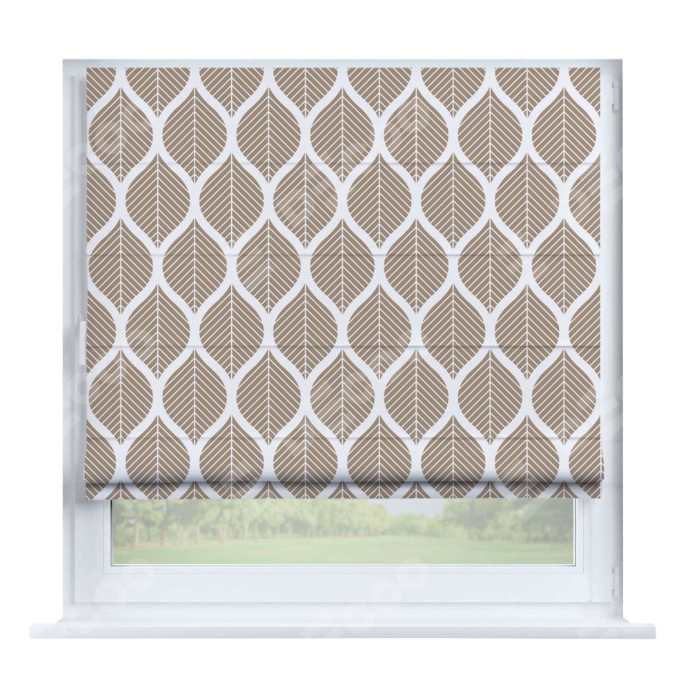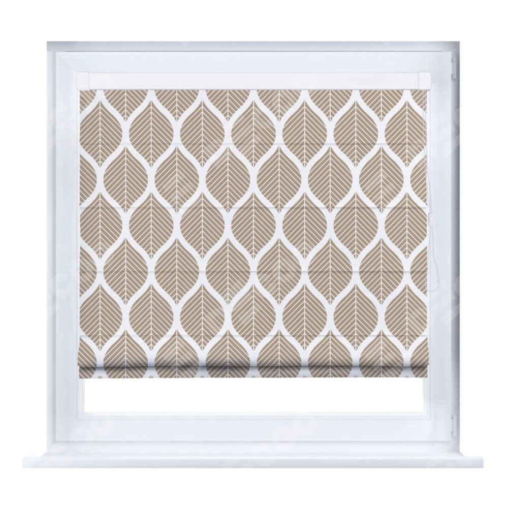 Римская штора производителя «Cortin», устанавливается на створку окна, пошита из ткани блэкаут с нанесением сублимационной печати «Листья геометрия». Штора шьётся по индивидуальным размерам, для данного типа римской шторы возможная ширина от 35 до 150 см., высота до 250 см.