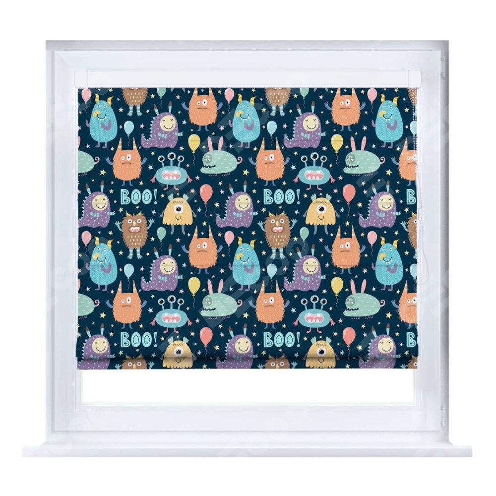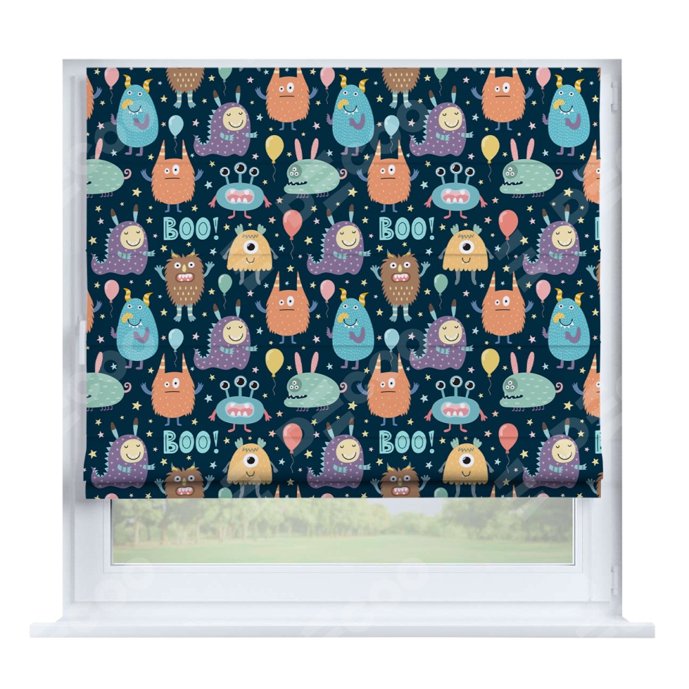 Римская штора производителя «Cortin», устанавливается на створку окна, пошита из ткани блэкаут с нанесением сублимационной печати «Звёздные страшилки». Штора шьётся по индивидуальным размерам, для данного типа римской шторы возможная ширина от 35 до 150 см., высота до 250 см.