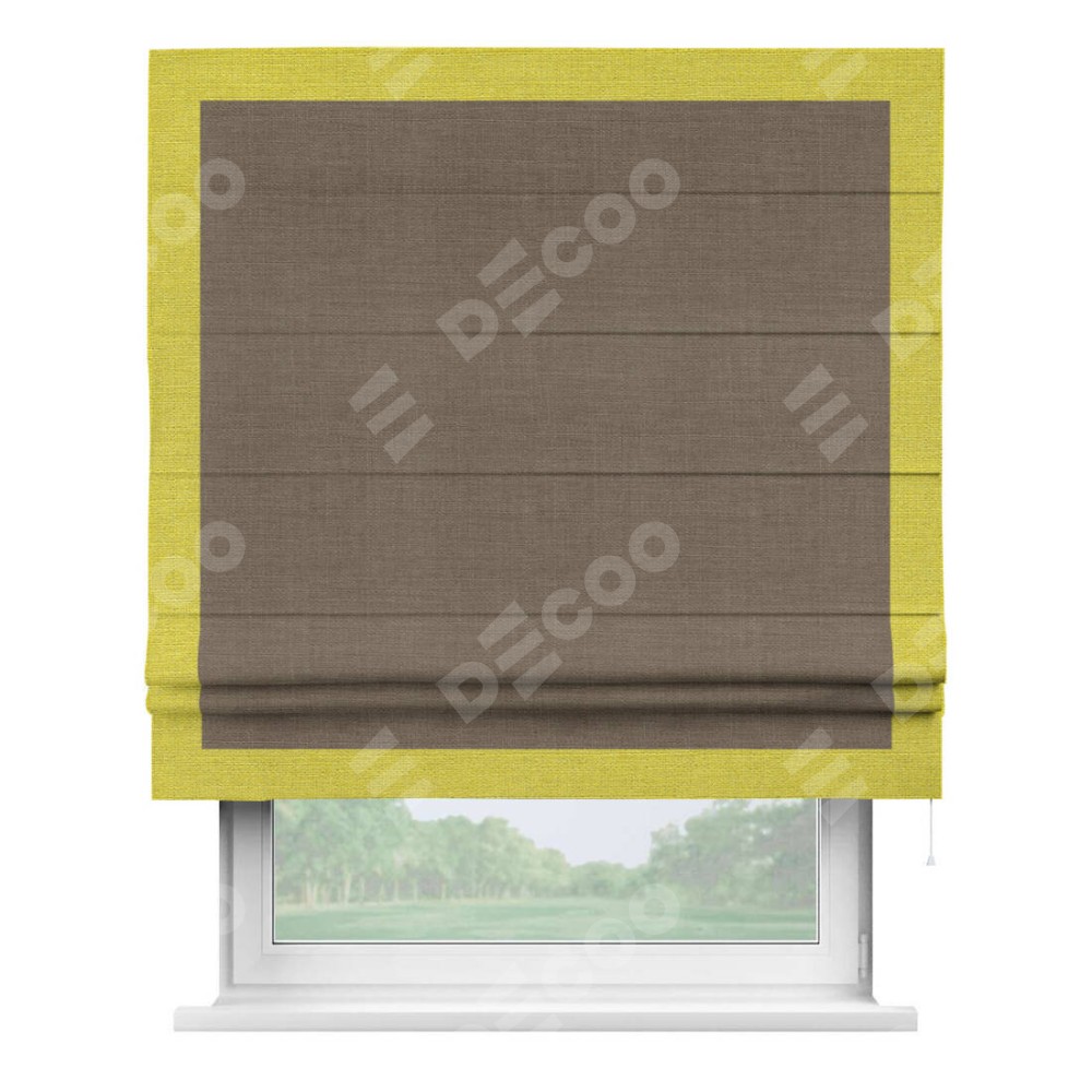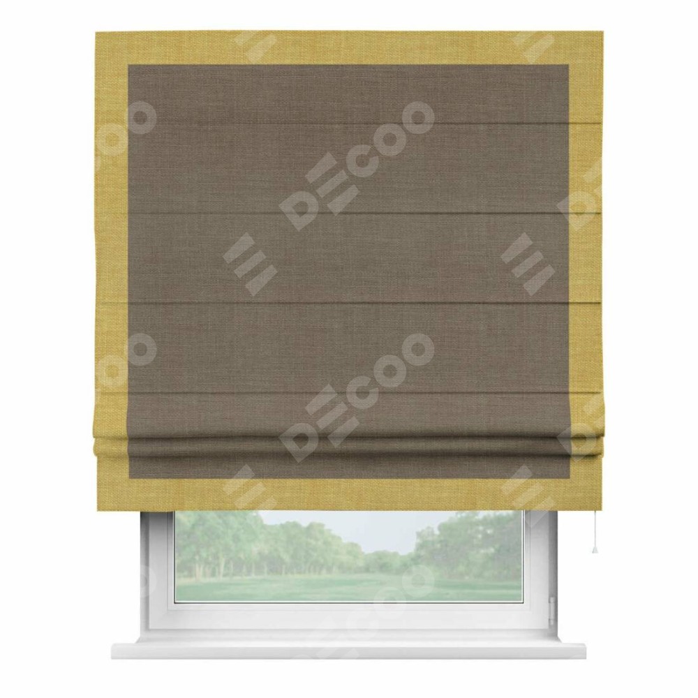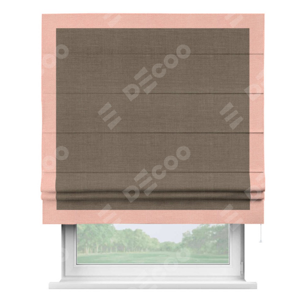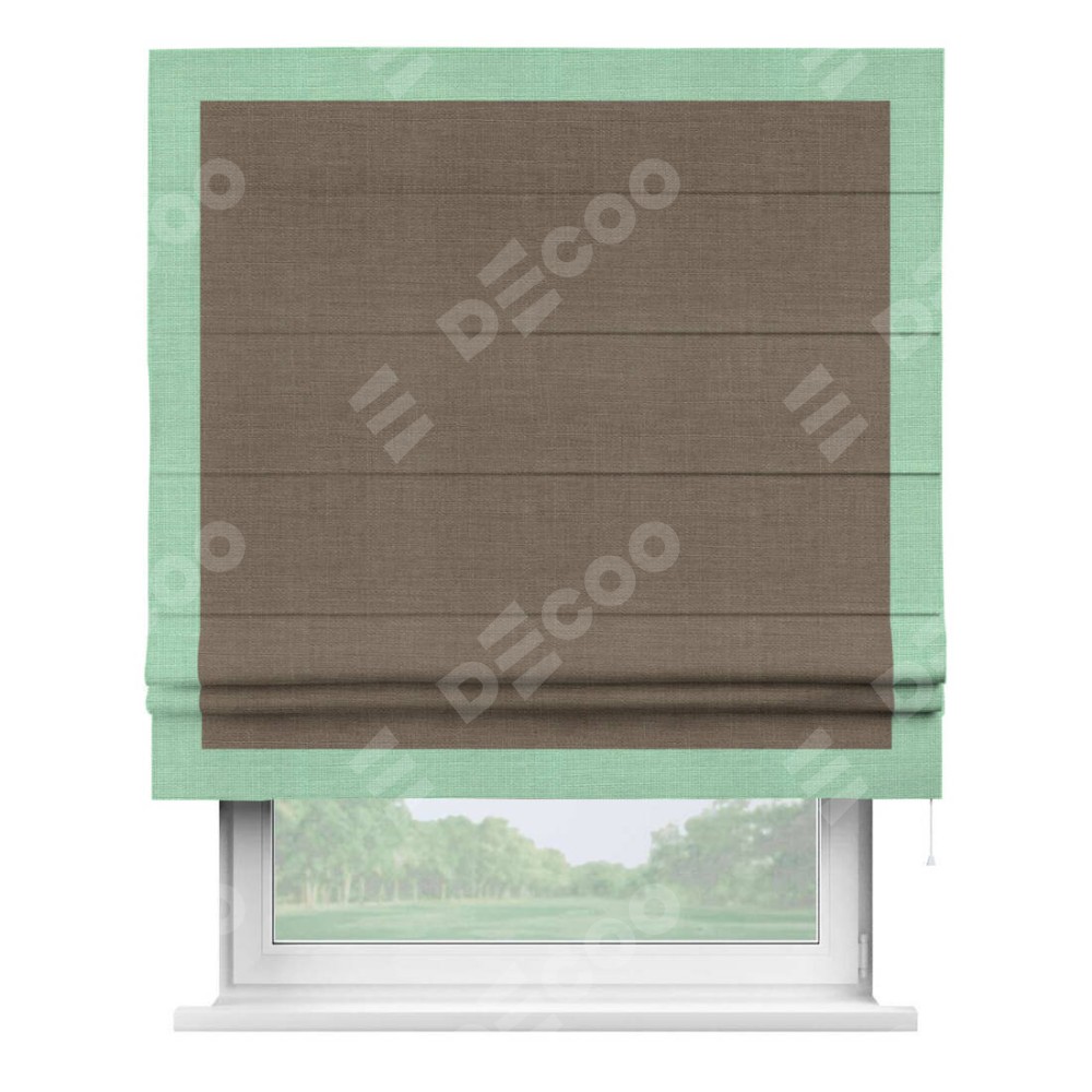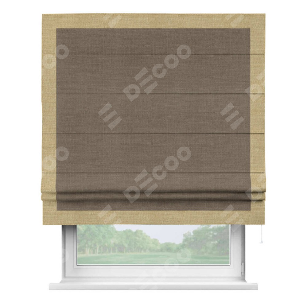 Римская штора производителя «Cortin», используется для проёма, пошита из ткани лён мокко, артикул 7444. Отделка шторы кантом «Чесс», ткань для канта используется из льна разной расцветки на выбор. Имеет универсальный механизм и подходит для монтажа: на потолок, на стену и в нишу.