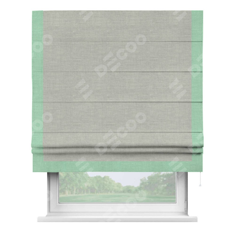 Римская штора производителя «Cortin», используется для проёма, пошита из ткани лён серый, артикул 7440. Отделка шторы кантом «Виктория», ткань для канта используется из льна разной расцветки на выбор. Имеет универсальный механизм и подходит для монтажа: на потолок, на стену и в нишу.