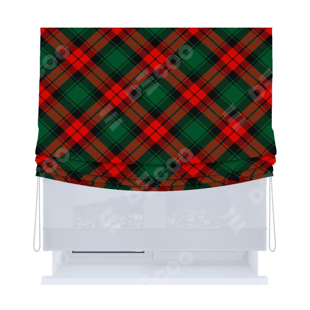 Римская штора день-ночь производителя «Cortin», используется для проёма, пошита из двух полотен, с лицевой блэкаут с нанесением сублимационной печати «Красно-зелёная клетка», вторая ткань тюль (по стандарту комплектуется тюль белого цвета артикул V-01). Имеет универсальный механизм и подходит для монтажа: на потолок, на стену и в нишу. Удобное управление каждой шторой отдельно.