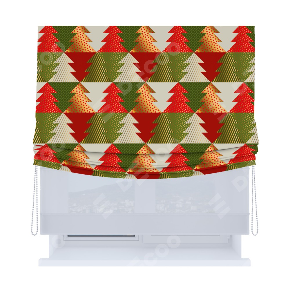 Римская штора день-ночь производителя «Cortin», используется для проёма, пошита из двух полотен, с лицевой блэкаут с нанесением сублимационной печати «Новогоднее украшение», вторая ткань тюль (по стандарту комплектуется тюль белого цвета артикул V-01). Имеет универсальный механизм и подходит для монтажа: на потолок, на стену и в нишу. Удобное управление каждой шторой отдельно.