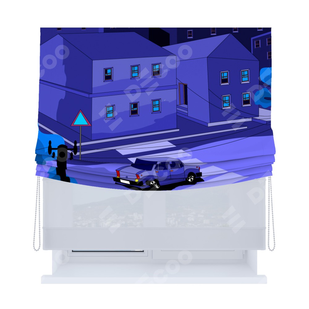 Римская штора день-ночь производителя «Cortin», используется для проёма, пошита из двух полотен, с лицевой блэкаут с нанесением сублимационной печати «Ночные улицы», вторая ткань тюль (по стандарту комплектуется тюль белого цвета артикул V-01). Имеет универсальный механизм и подходит для монтажа: на потолок, на стену и в нишу. Удобное управление каждой шторой отдельно.