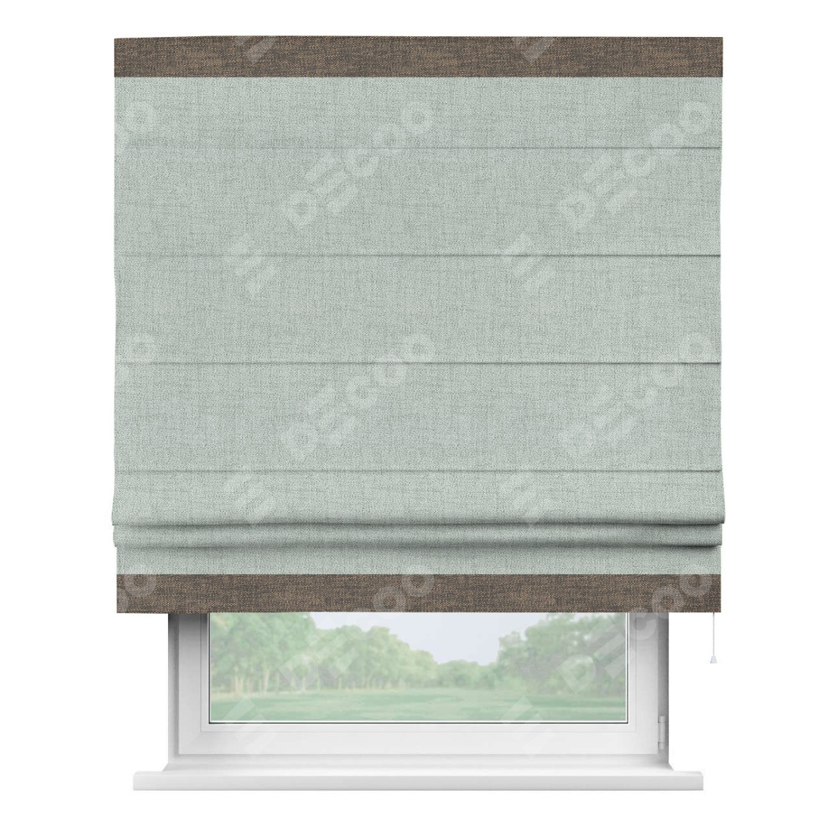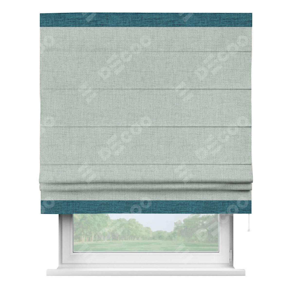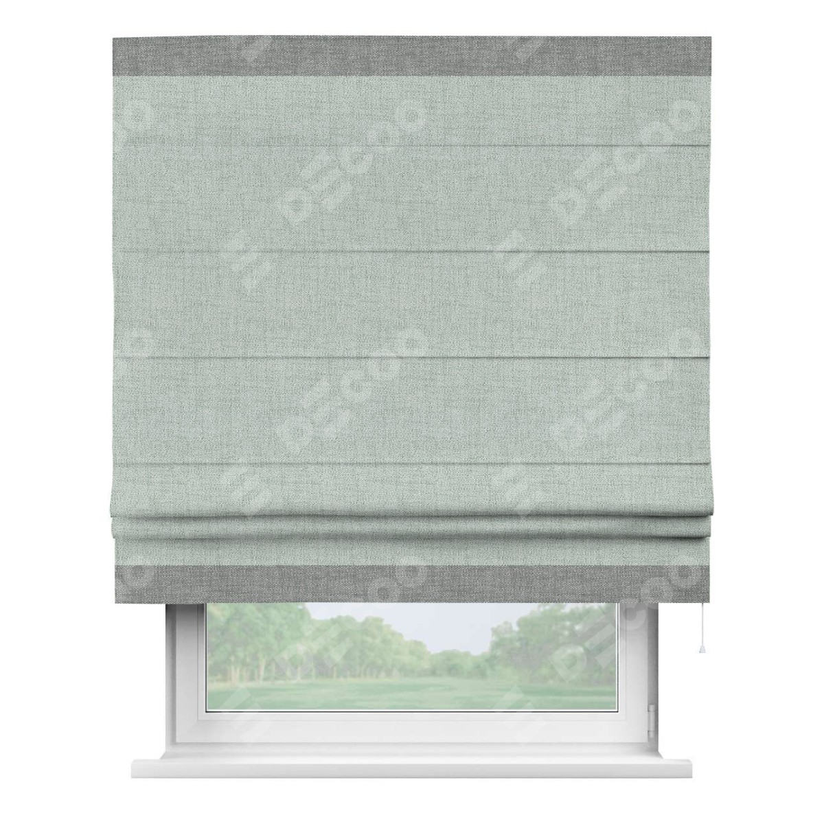 Римская штора производителя «Cortin», используется для проёма, пошита из ткани рогожка димаут серый, артикул 80426. Отделка шторы кантом «Горизонт», ткань для канта используется из рогожки димаут разной расцветки на выбор. Имеет универсальный механизм и подходит для монтажа: на потолок, на стену и в нишу.