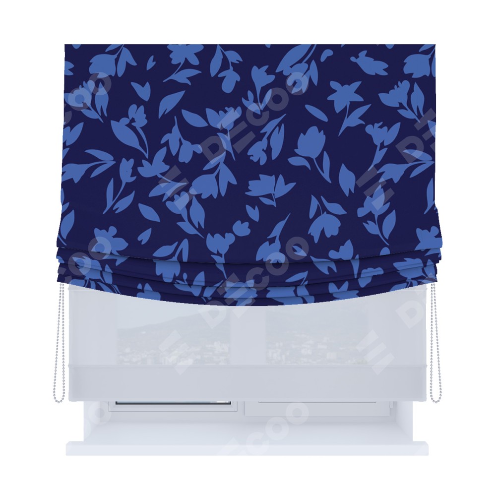 Римская штора день-ночь производителя «Cortin», используется для проёма, пошита из двух полотен, с лицевой блэкаут с нанесением сублимационной печати «Синие цветы», вторая ткань тюль (по стандарту комплектуется тюль белого цвета артикул V-01). Имеет универсальный механизм и подходит для монтажа: на потолок, на стену и в нишу. Удобное управление каждой шторой отдельно.